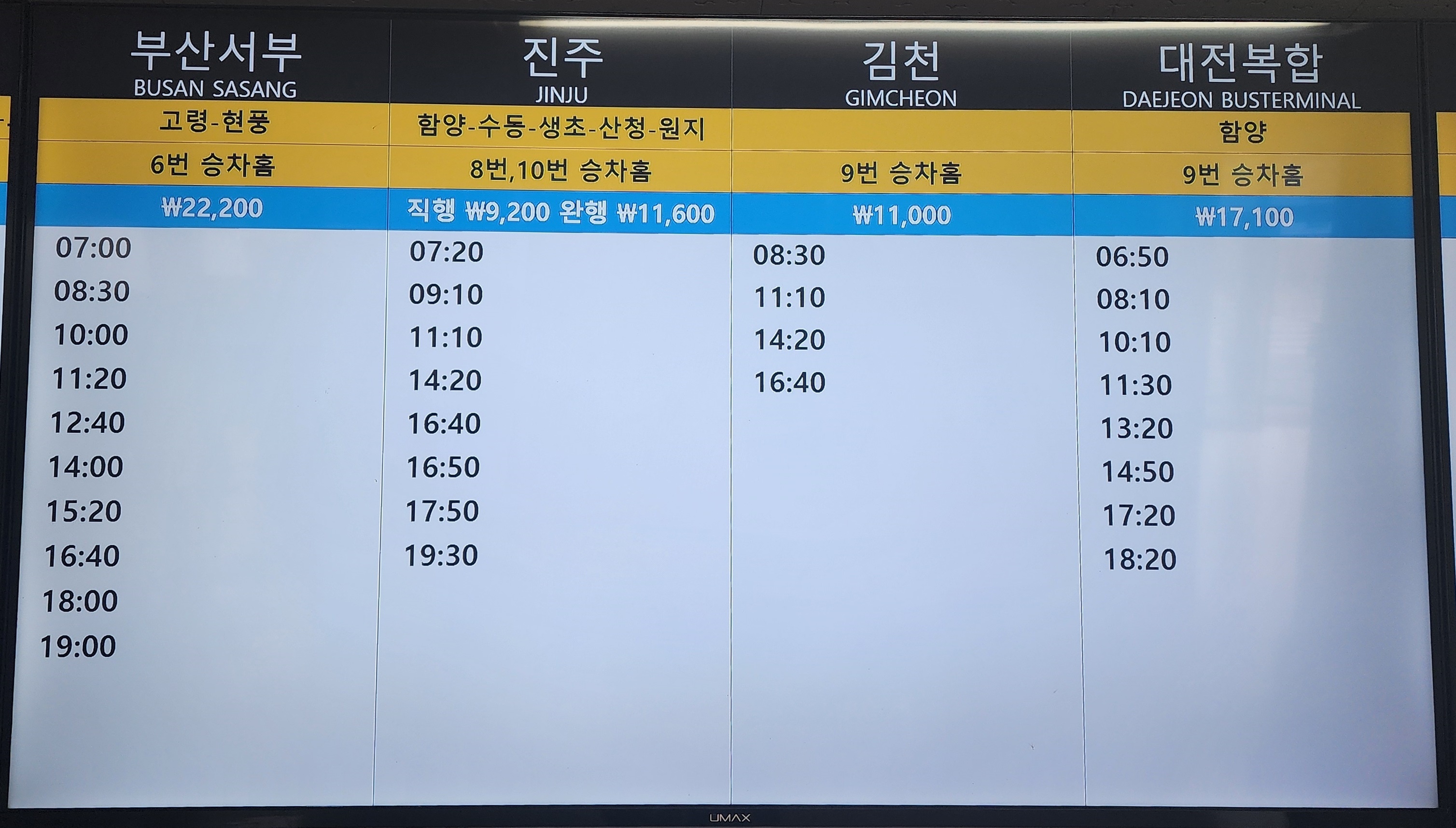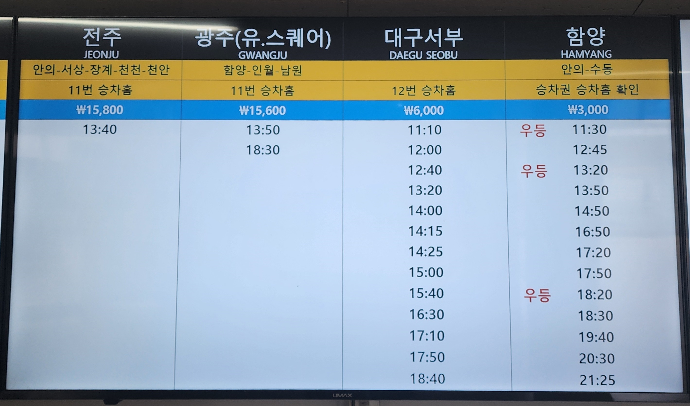 거창 출발 전주, 광주 유스퀘어, 대구 서부, 함양 방면.