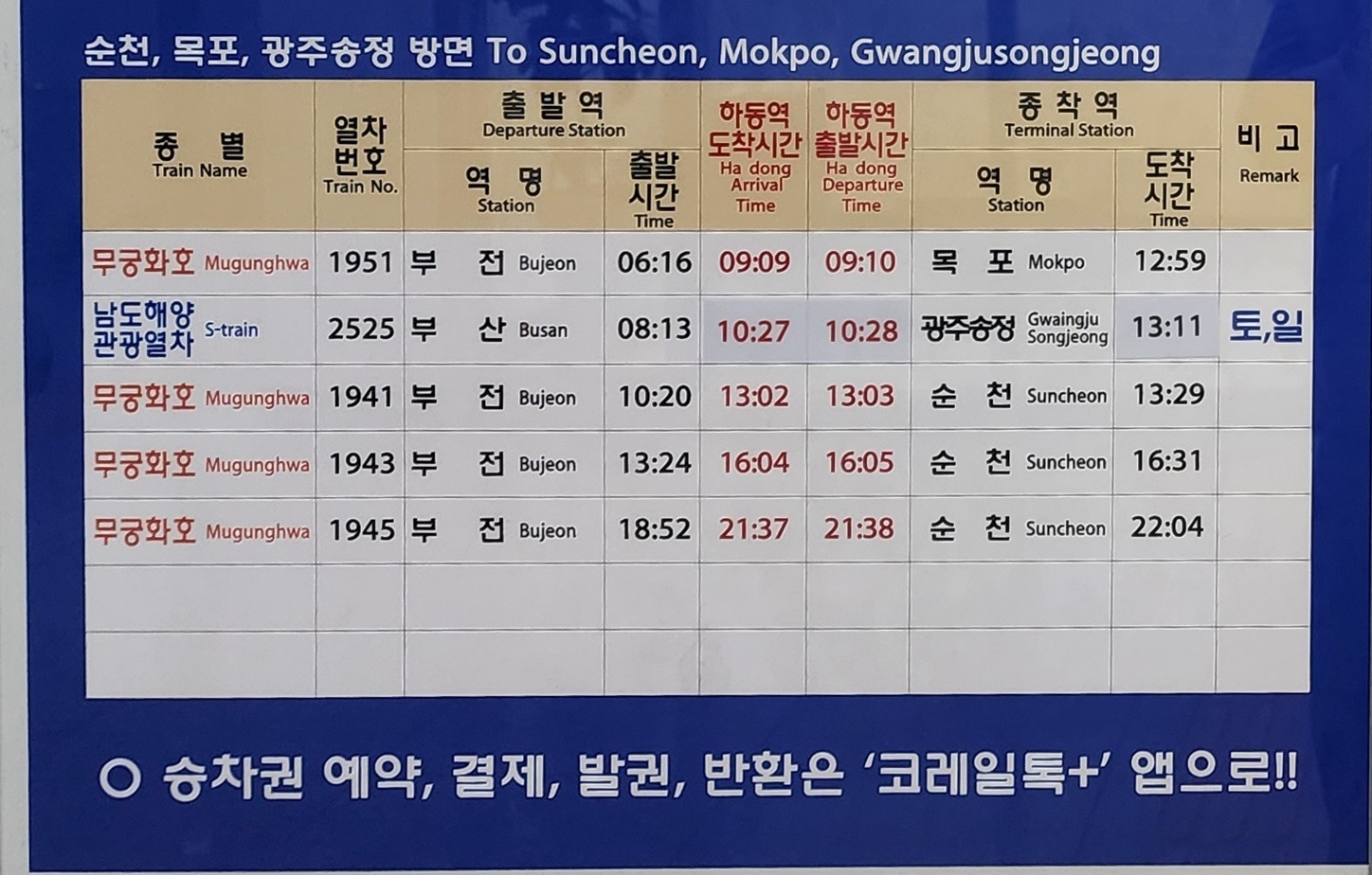하동역 출발 진주, 마산, 부전, 부산 방면.