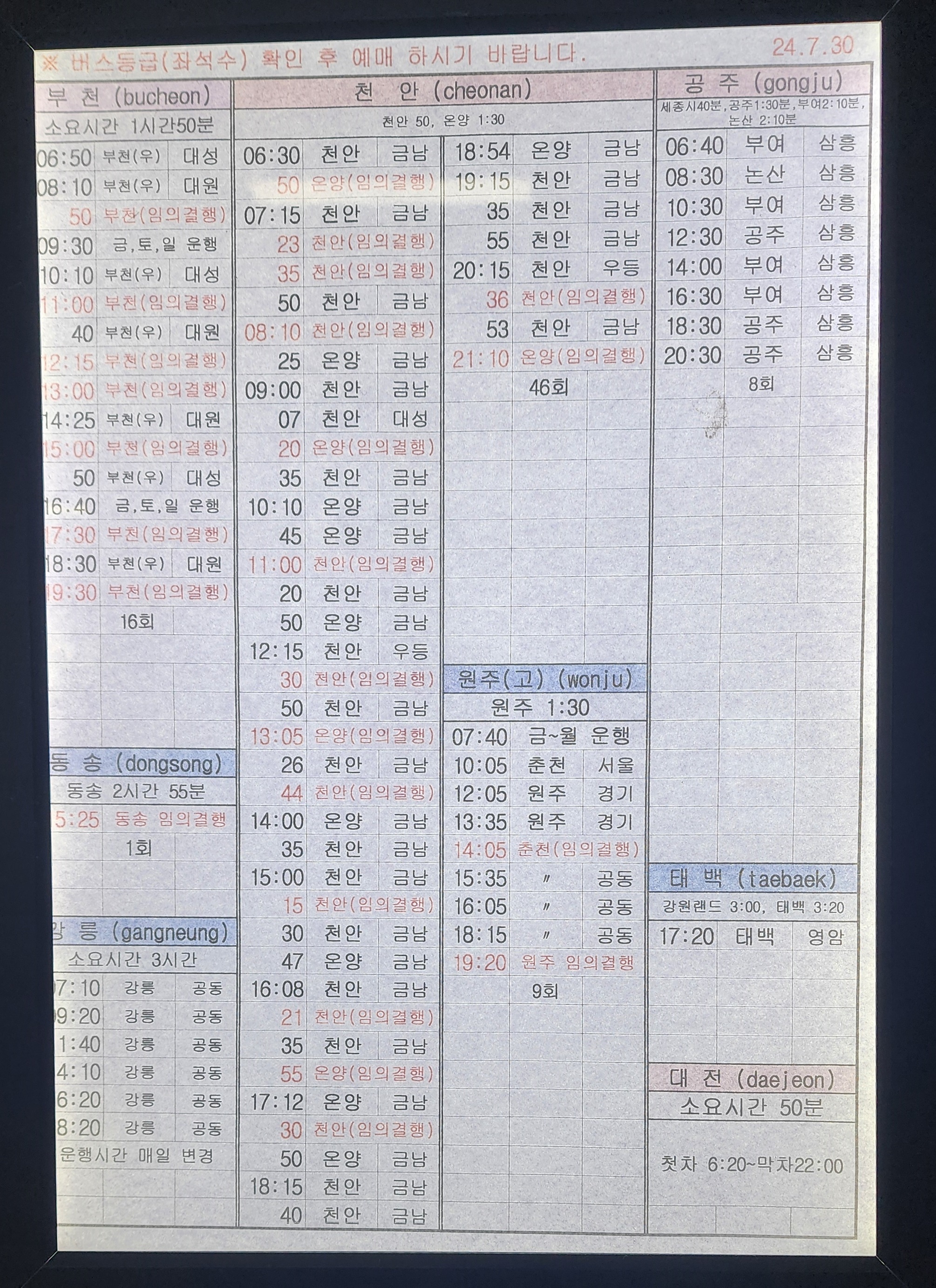 청주 출발 부천, 동송, 강릉, 천안, 원주, 공주, 태백, 대전 방면.
