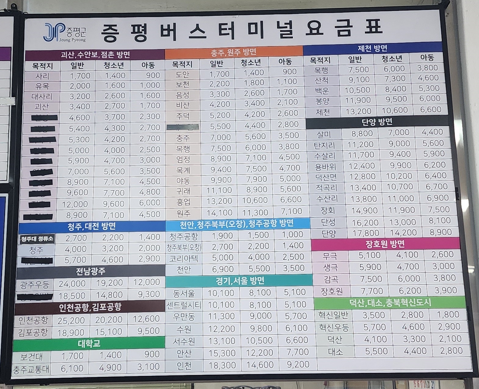 증평시외버스터미널 요금표