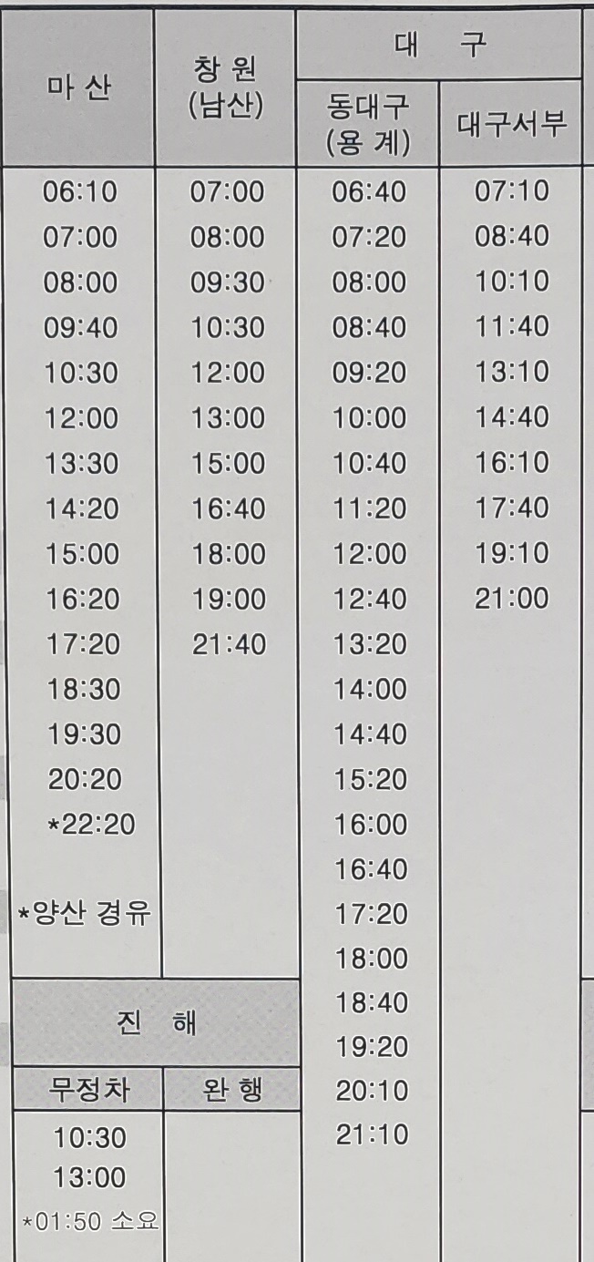 울산 출발 마산, 창원, 진해, 남산, 대구, 동대구, 용계, 대구서부 방면.