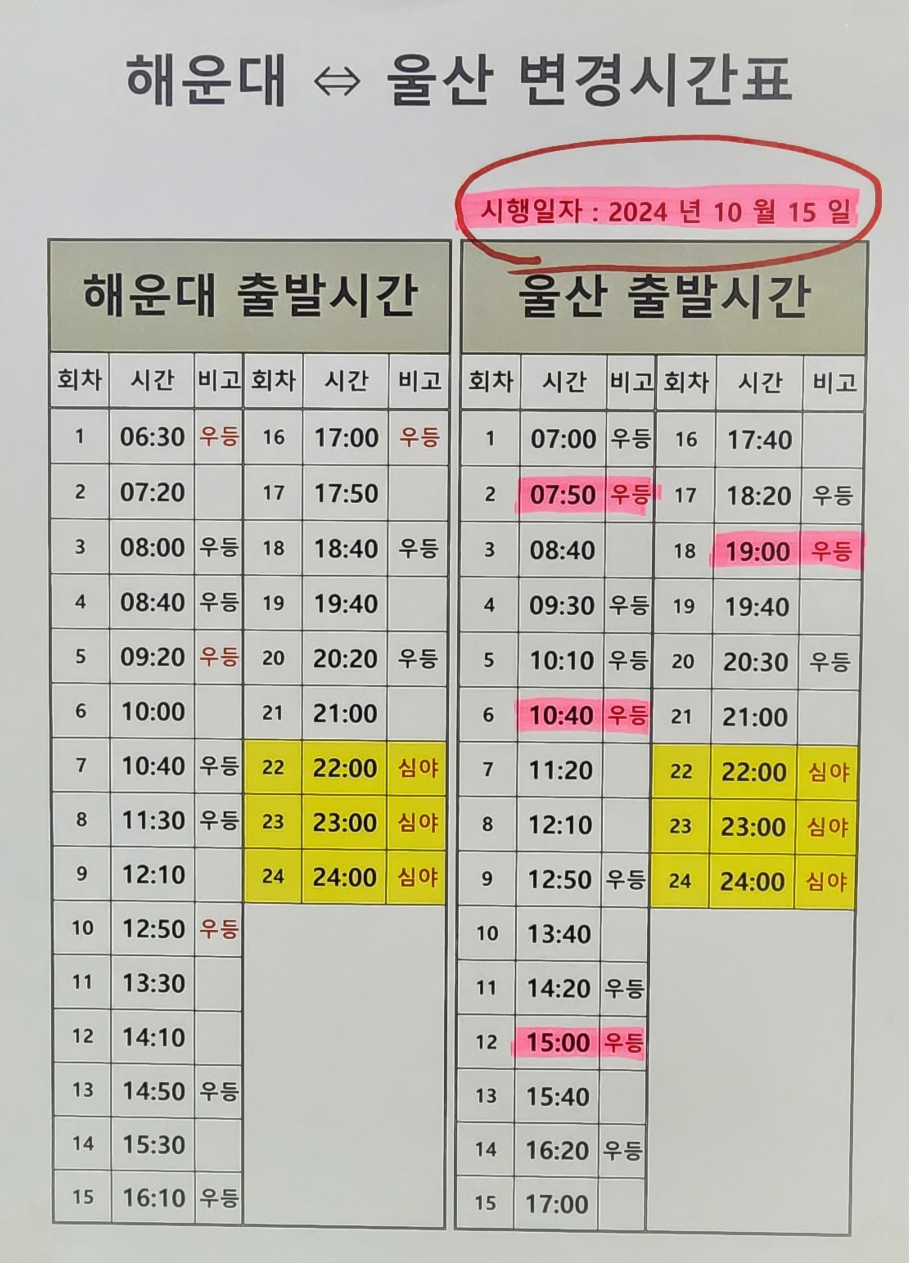 울산 출발 해운대 방면 시간 변경