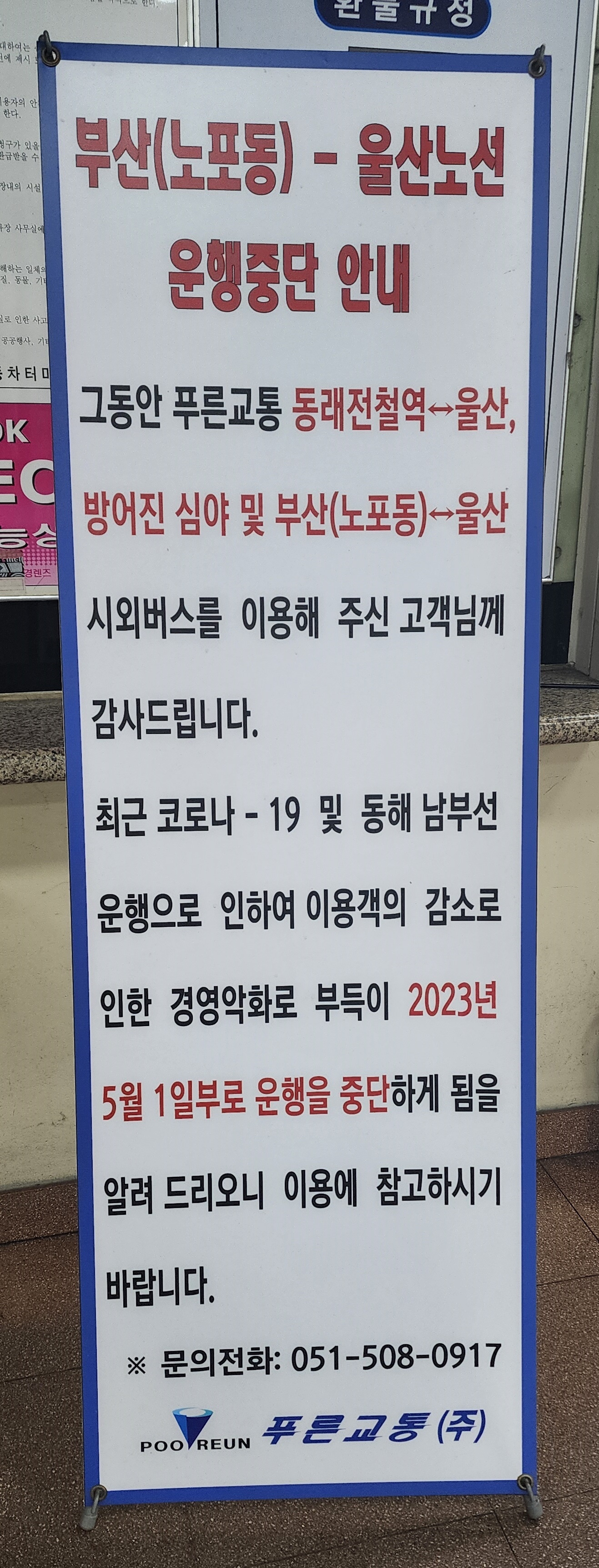 울산 출발 부산 노포동 운행중단 안내