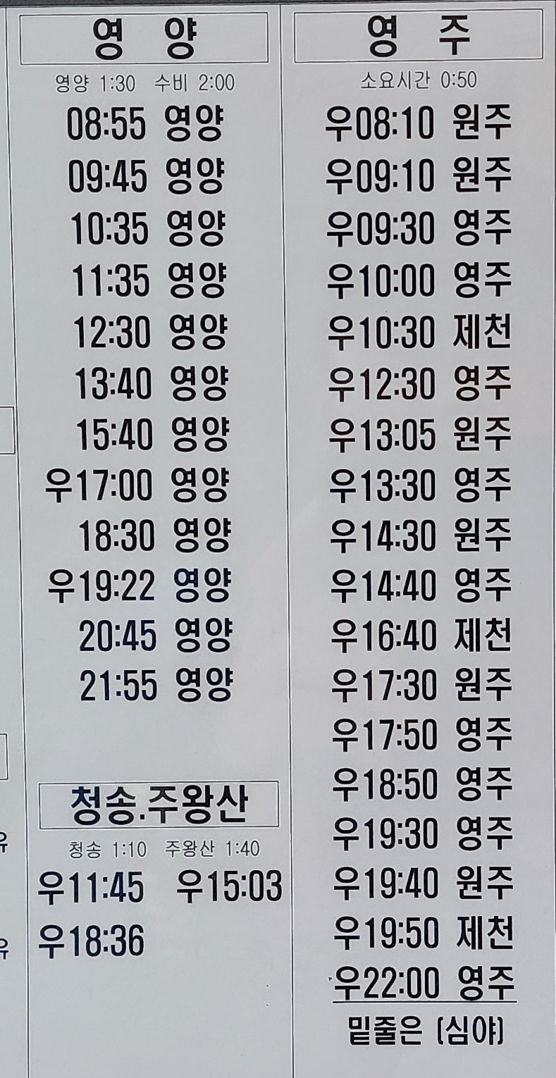 안동 출발 영양, 청송, 주왕산, 영주 방면.