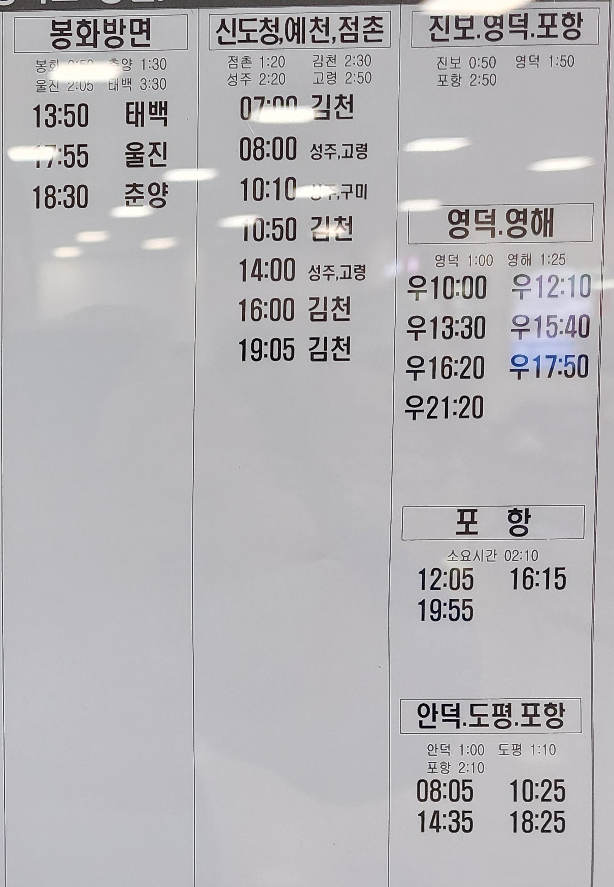 안동 출발 봉화, 신도청, 예천, 점촌, 진보, 영덕, 영해, 안덕, 도평, 포항 방면.