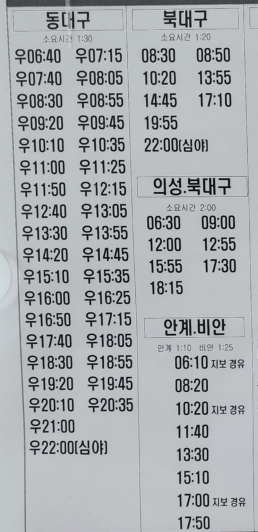 안동 출발 동대구, 의성, 북대구, 안계, 비안 방면.