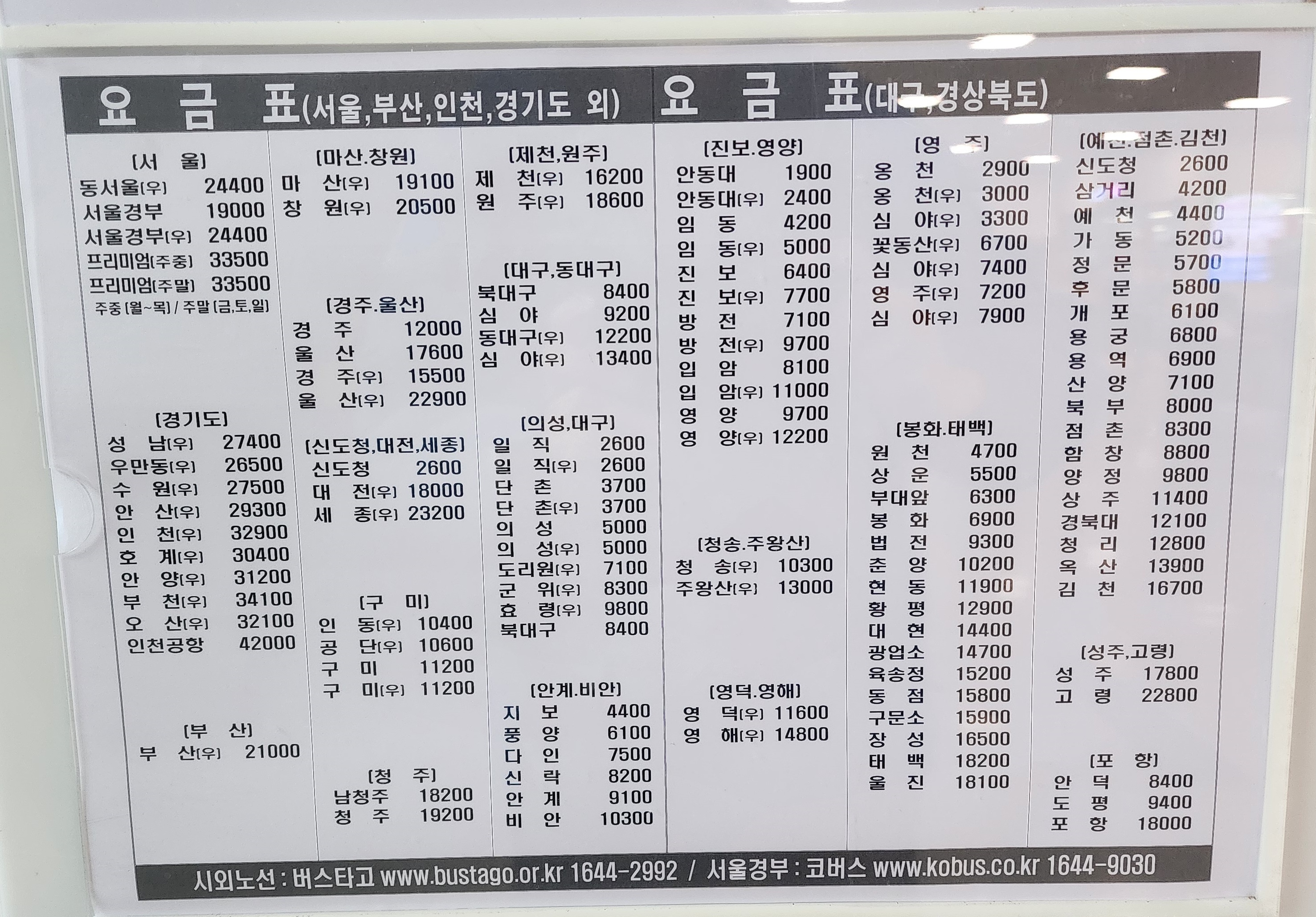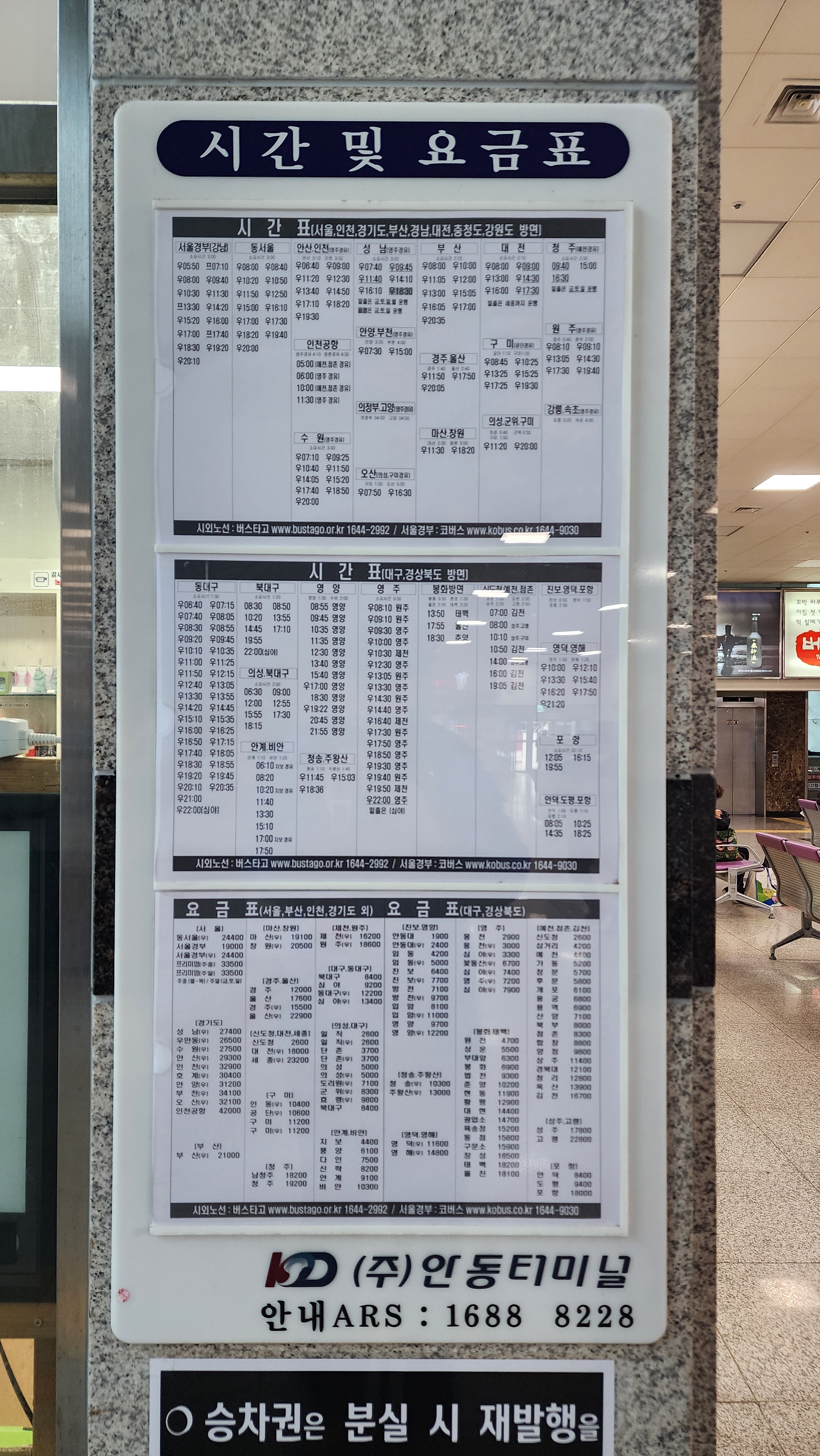안동시외버스터미널 요금표