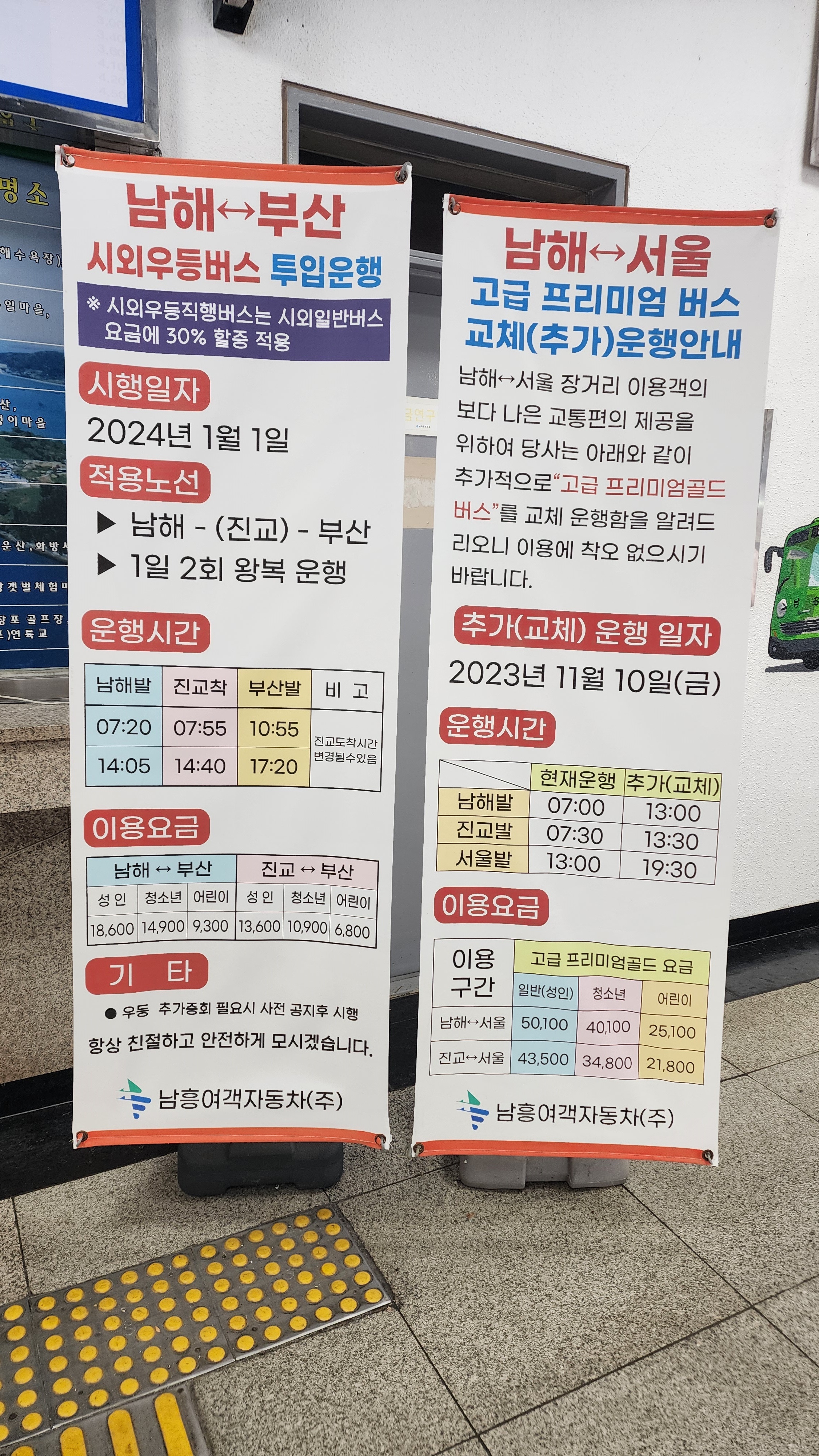 남해 출발 부산, 대전, 진주, 마산, 창원, 서울 방면.