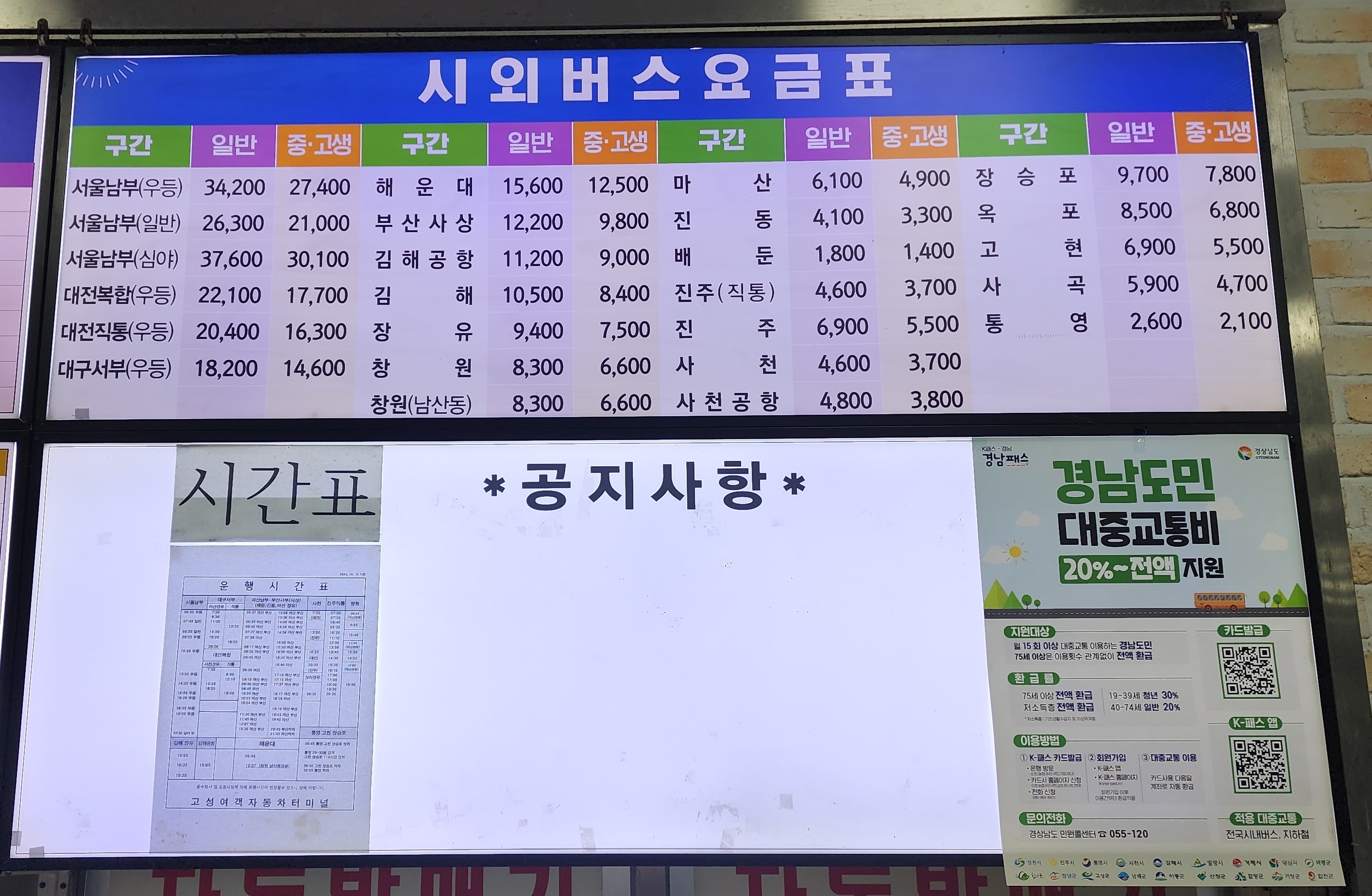 고성 출발 서울, 대전, 대구, 마산, 창원, 진주, 사천, 해운대, 장유, 김해, 김해공항 방면.