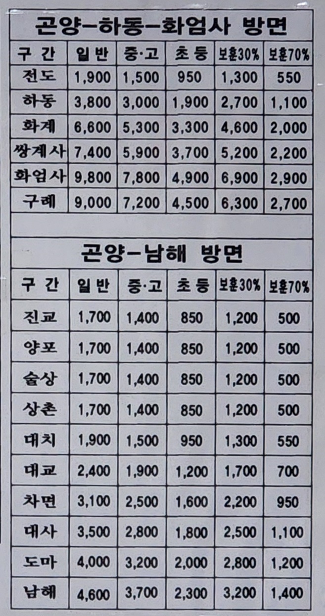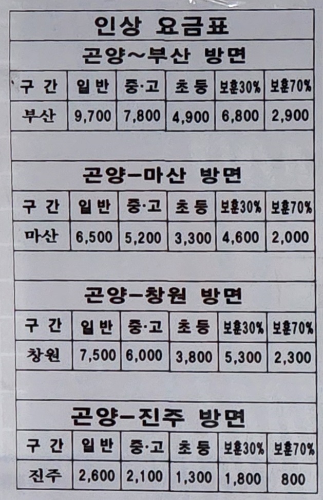 곤양시외버스터미널 요금표