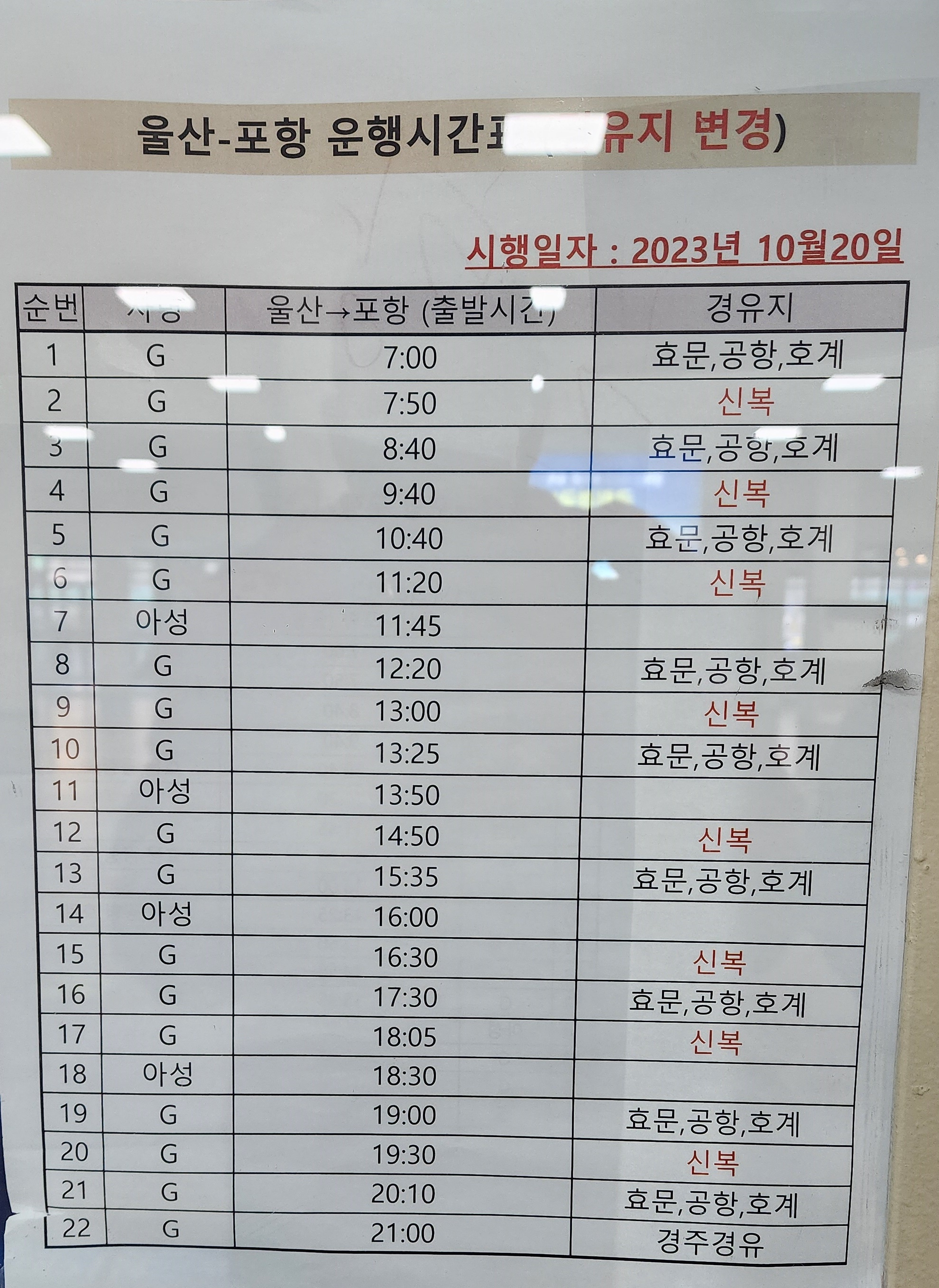 울산발 시외버스 운행시간표 2025년 1월 1일 현재 운행 시간