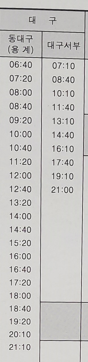 울산 출발 대구, 동대구, 용계, 대구서부 방면.