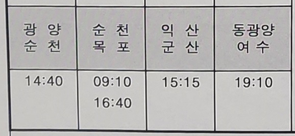 울산 출발 광양, 순천, 목포, 익산, 군산, 동광양, 여수 방면.