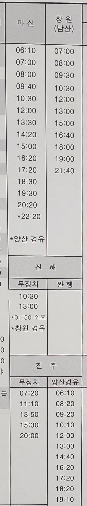 울산 출발 마산, 진해, 창원, 남산, 진주 방면.