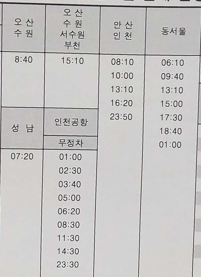울산 출발 오산, 수원, 서수원, 부천, 안산, 인천, 동서울, 성남, 인천공항, 방면.