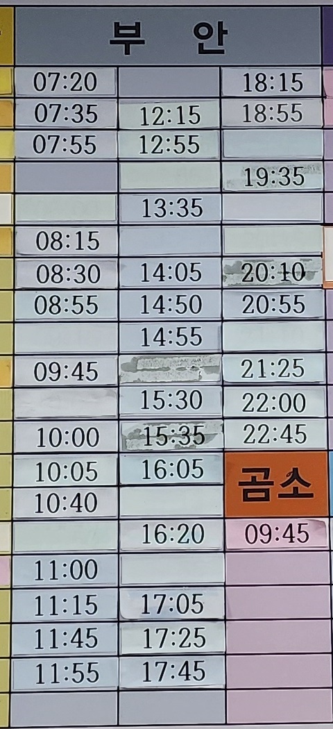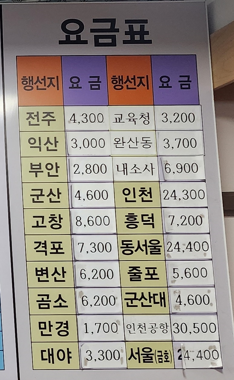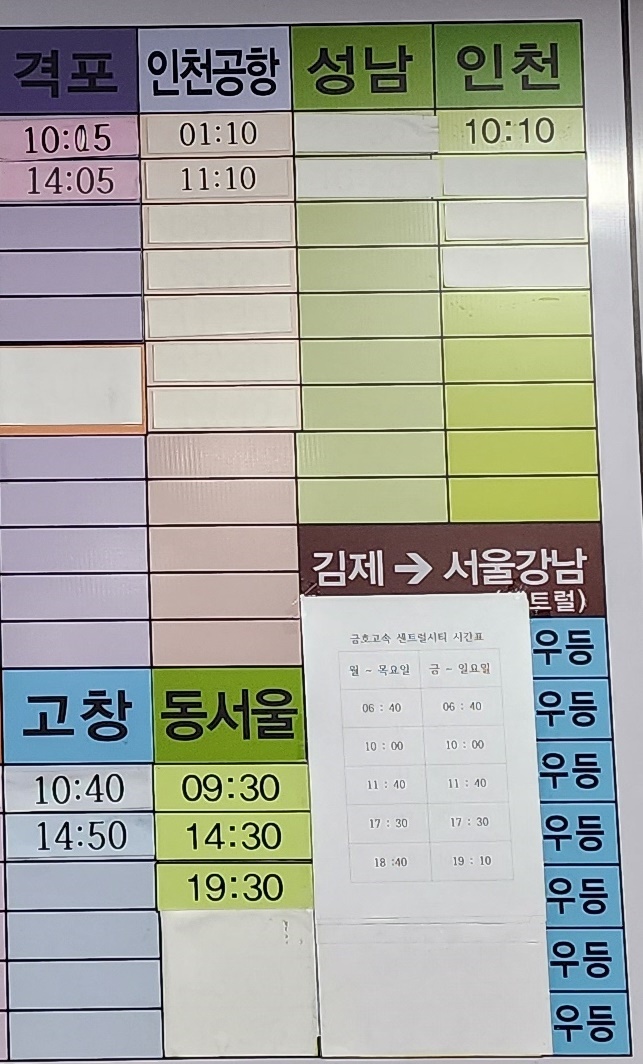 김제 출발 격포, 고창, 동서울, 인천공항, 인천 방면.