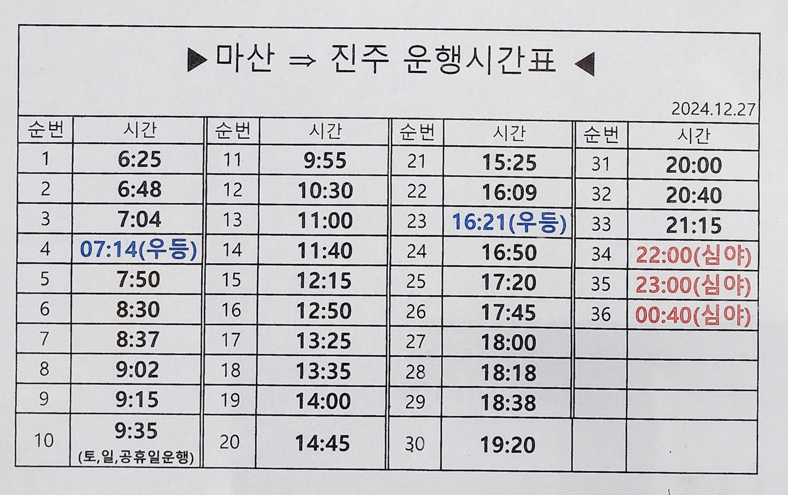 마산 출발 전주, 익산, 군산, 구미, 안동 방면.
