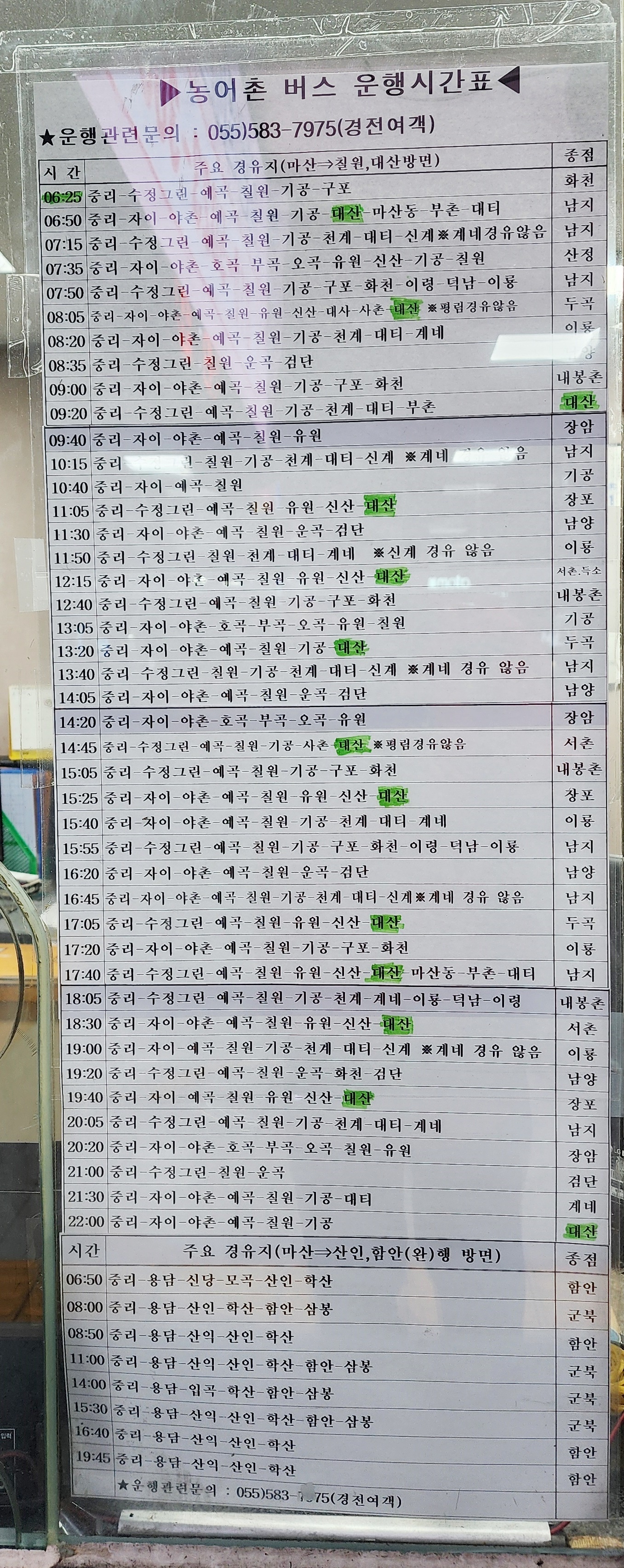 마산 출발 의령, 합천, 대산, 신반, 정곡, 남지, 창녕 방면.