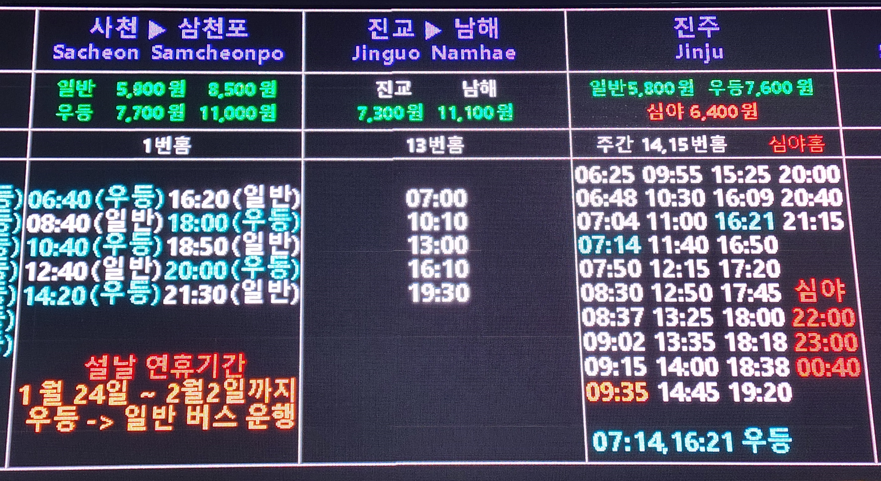 마산 출발 사천, 삼천포, 진교, 남해, 진주 방면.