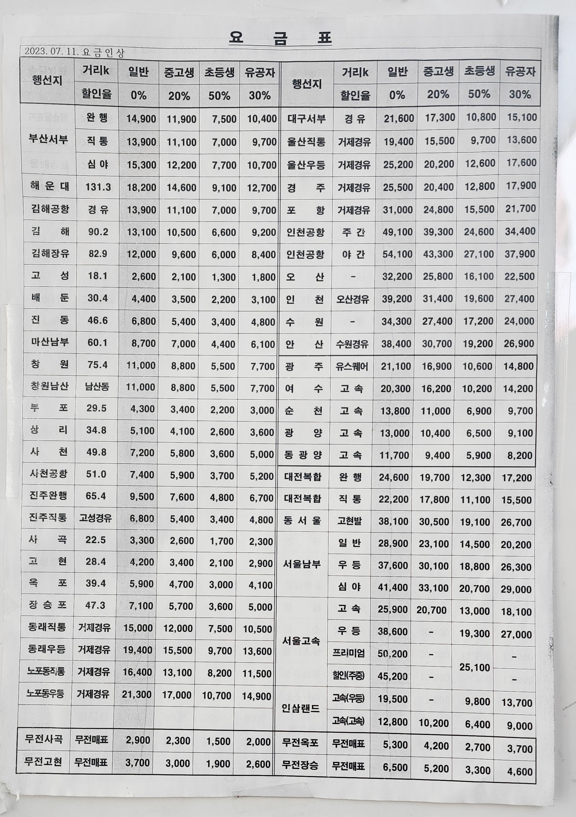 통영시외버스터미널 요금표