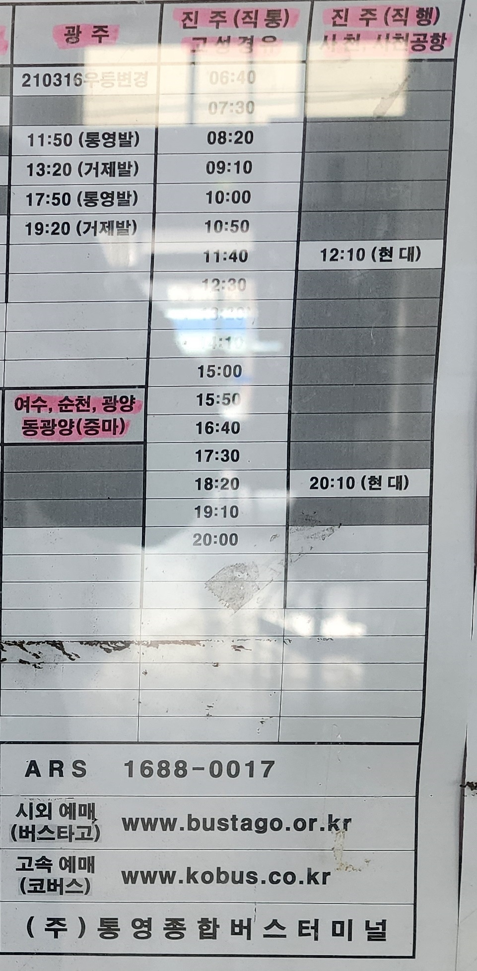 통영 출발 광주, 진주, 여수, 순천, 광양, 동광양 방면.