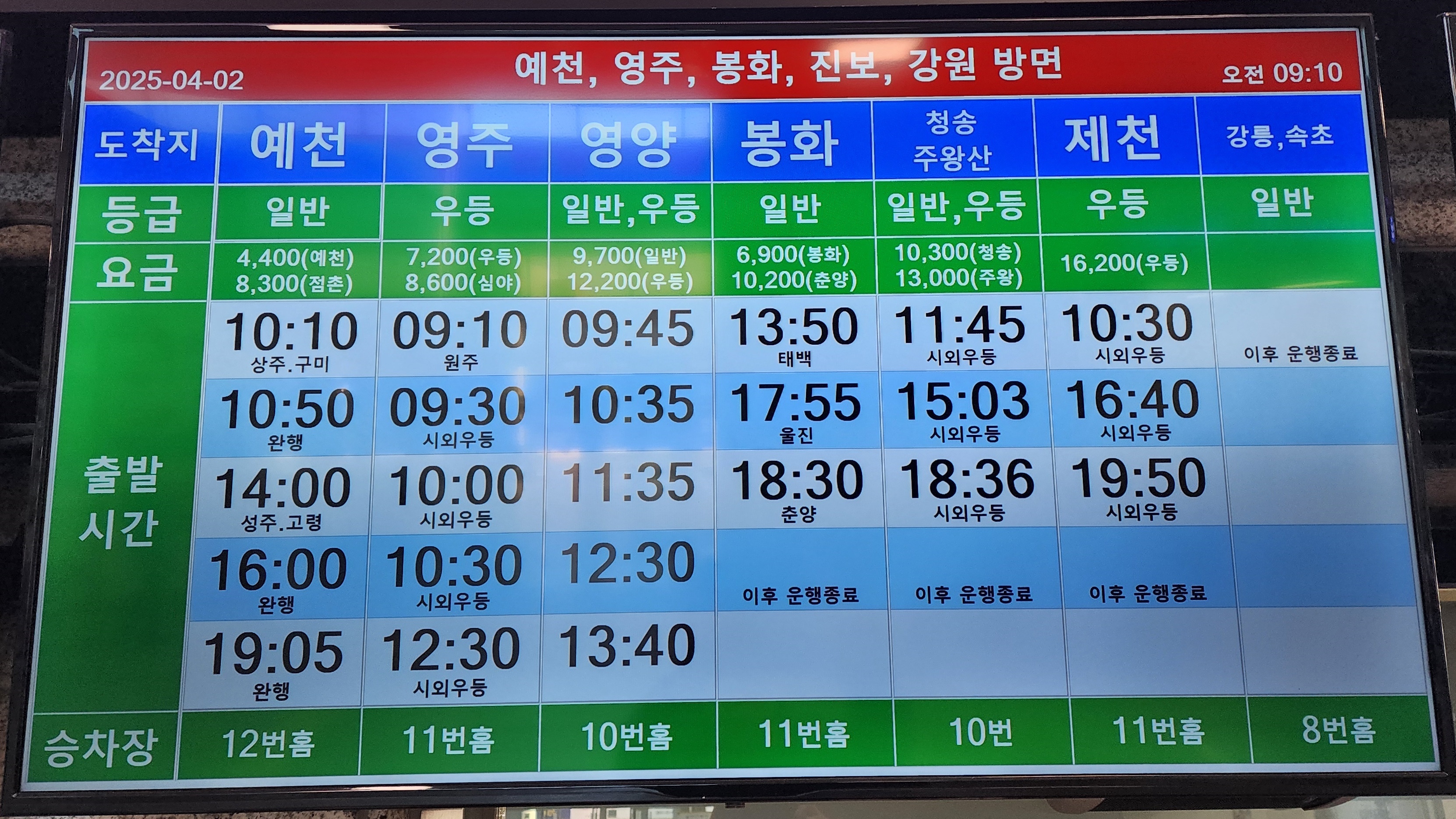 안동 출발 예천, 영주, 봉화, 진보, 강원 방면.
