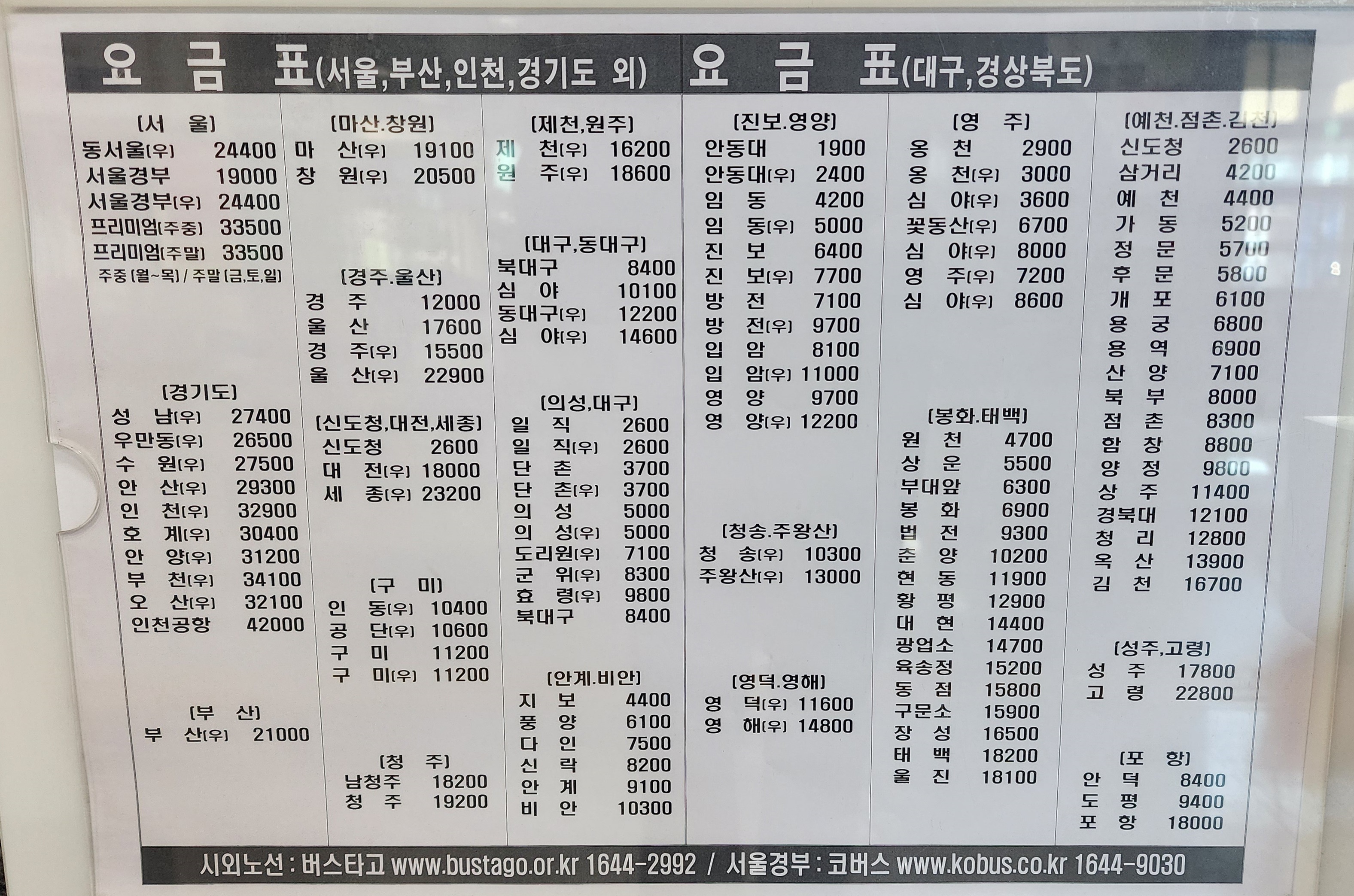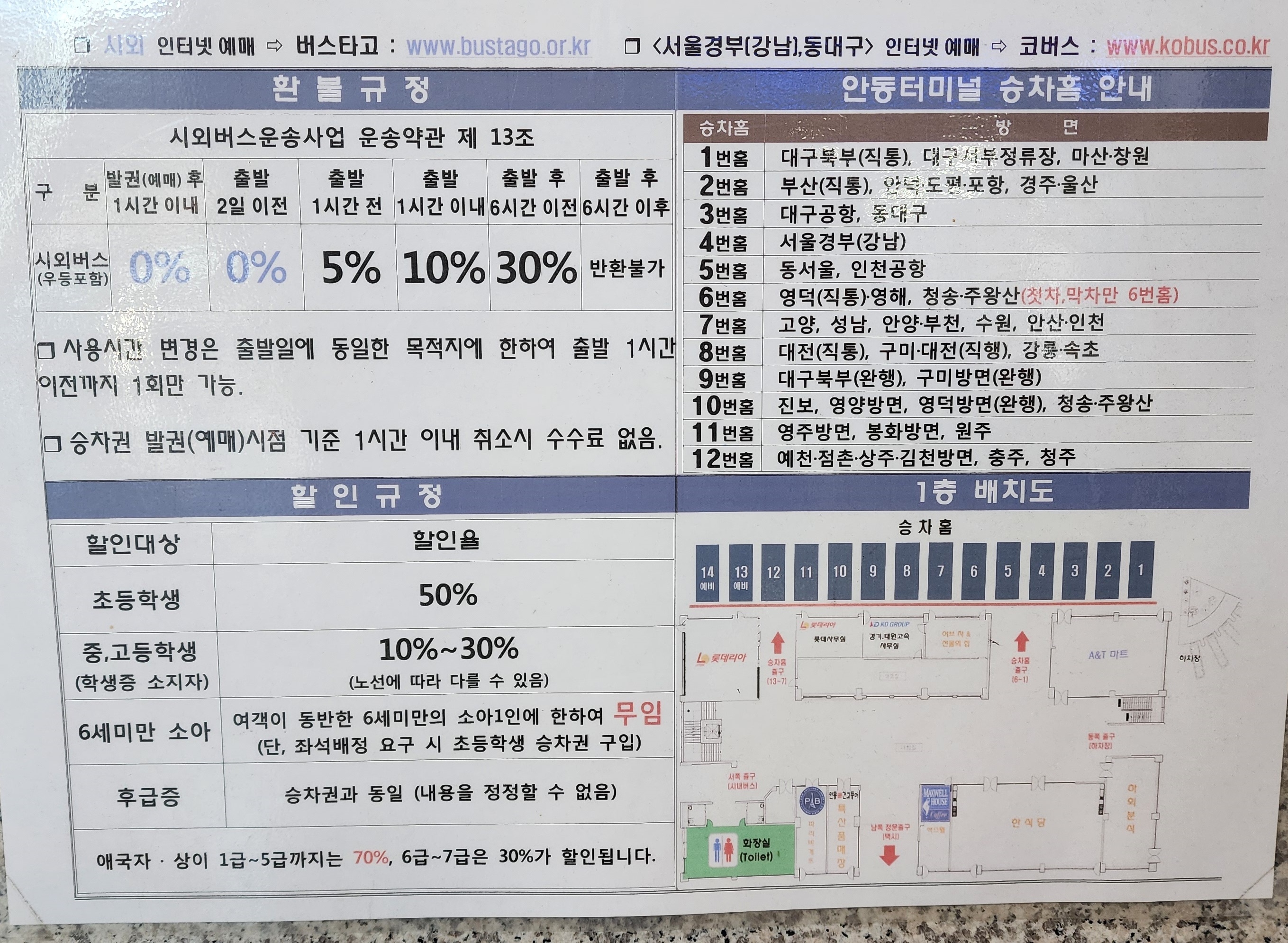안동시외버스터미널 요금표