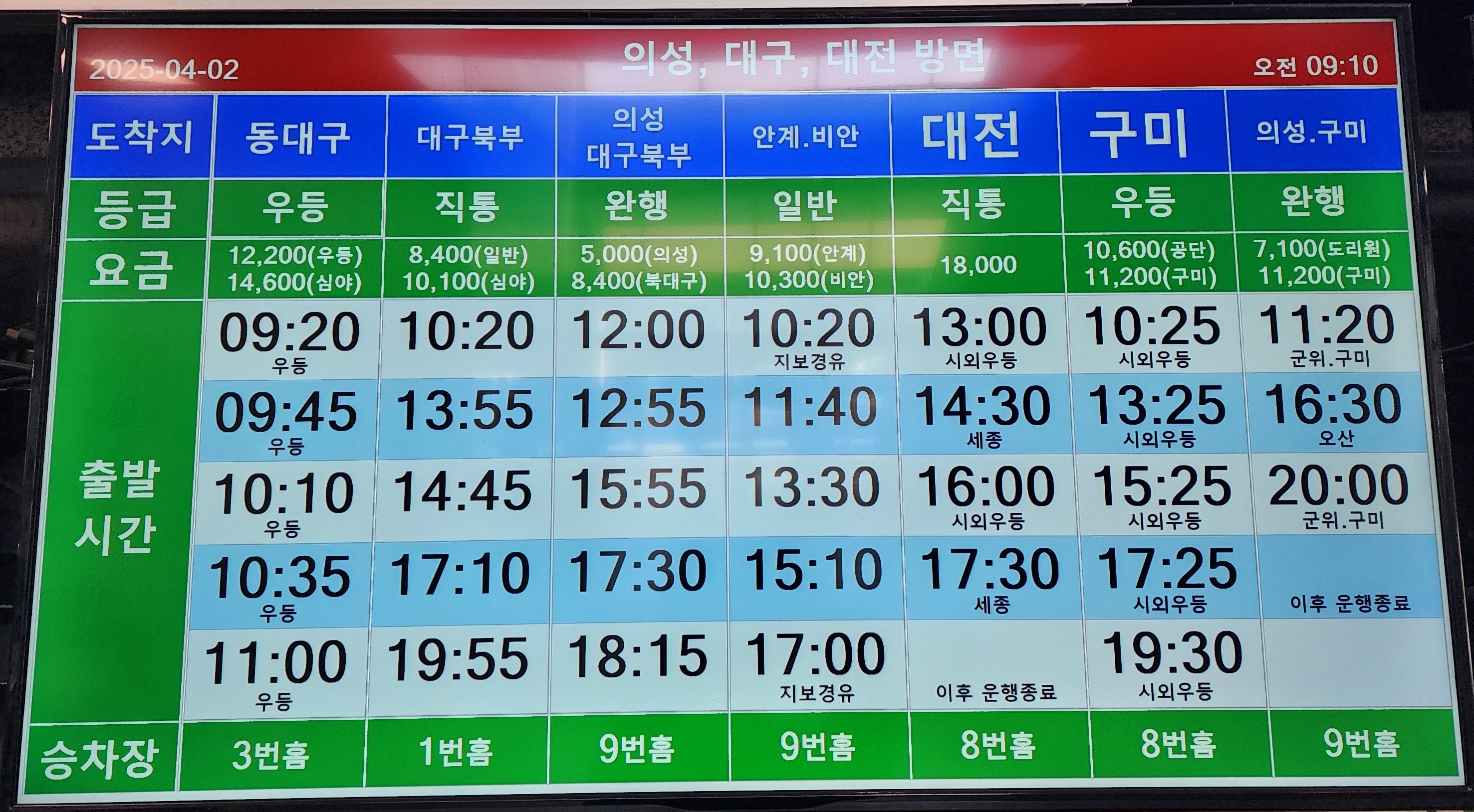 안동 출발 의성, 대구, 대전 방면.