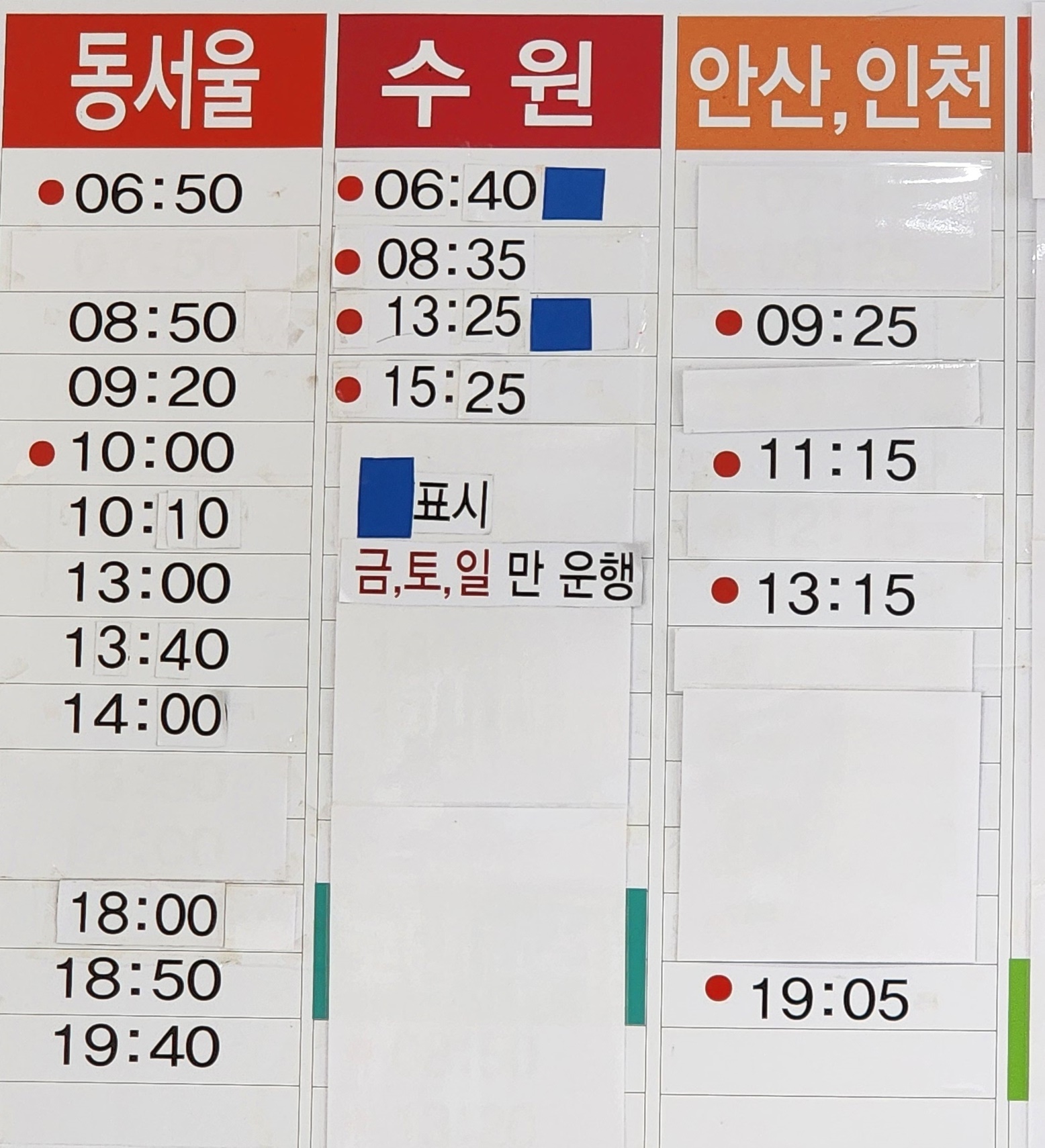 문경 출발 동서울, 수원, 안산, 인천 방면.