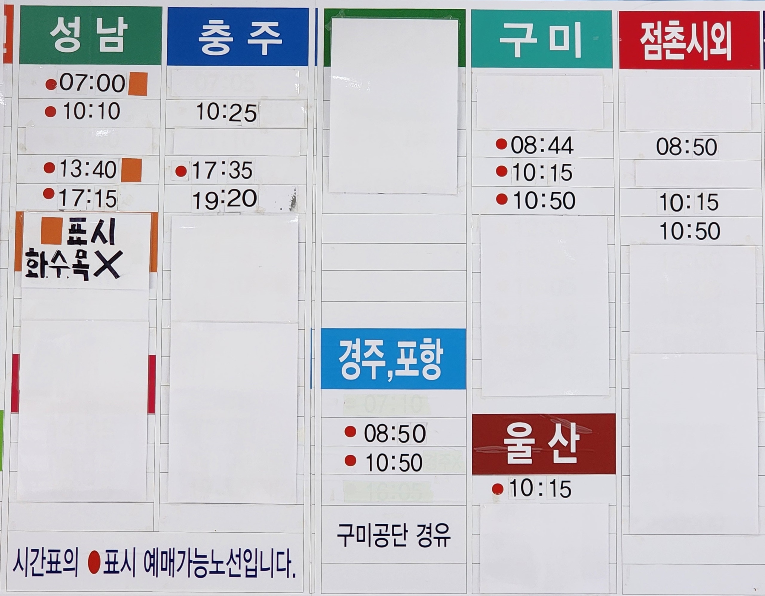 문경 출발 성남, 충주, 경주, 포항, 구미, 울산, 점촌시외 방면.