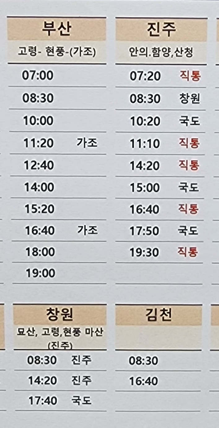 거창 출발 부산, 고령, 현풍, 가조, 진주, 안의 함양, 산청, 창원, 김천 방면.