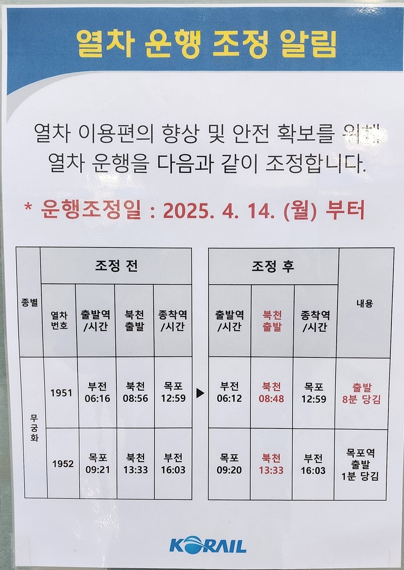 부전역 출발 북천역 경유 순천, 목포, 광주송정 방면.