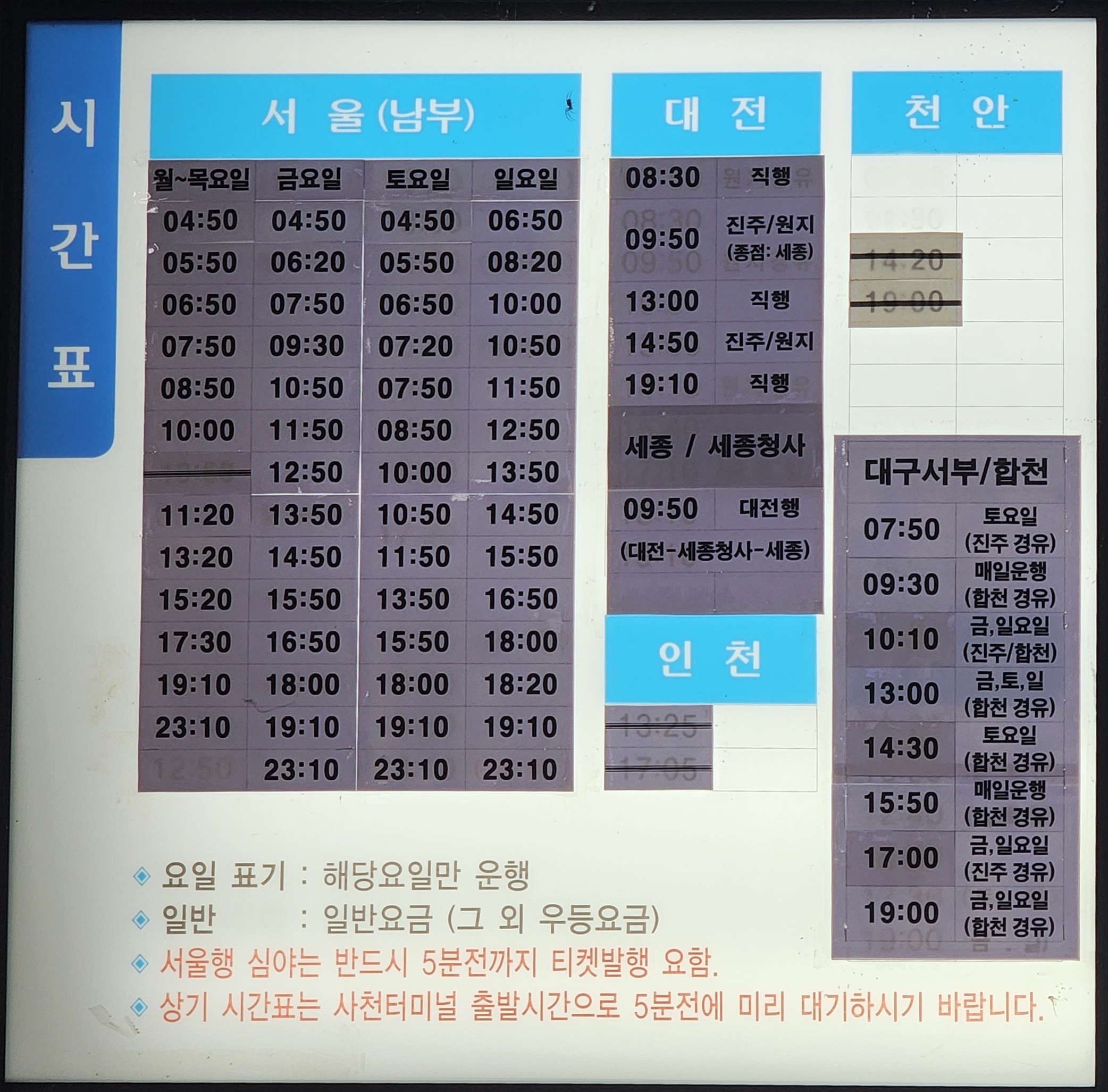사천 출발 서울 남부, 대전, 대구서부, 합천 방면.