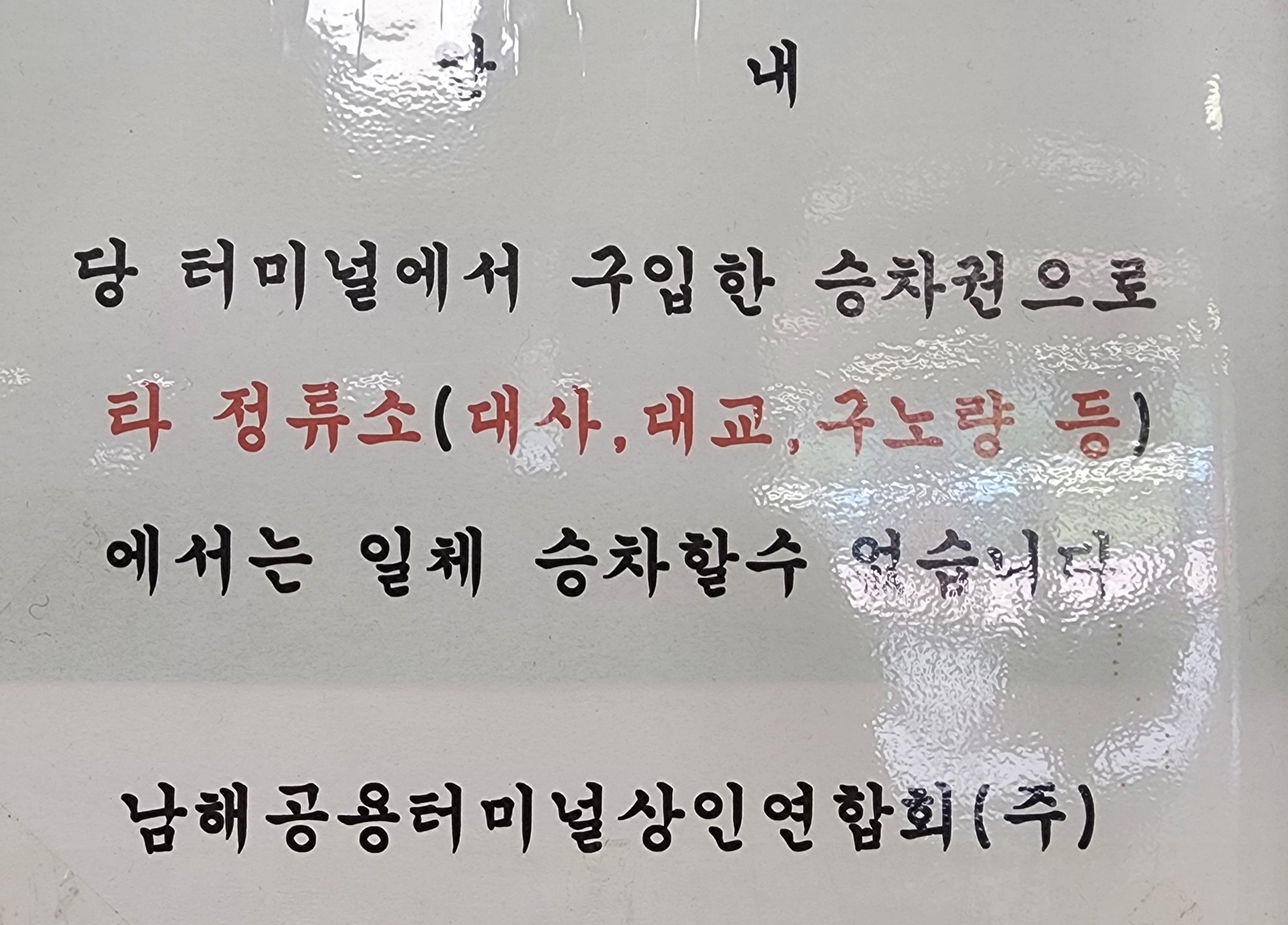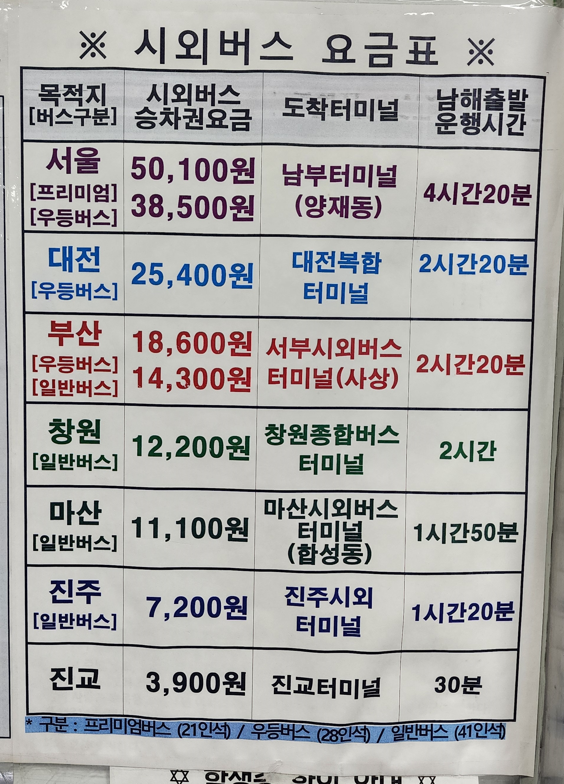 남해 출발 부산 서부, 진주, 곤양, 마산, 창원, 대전, 서울 방면.