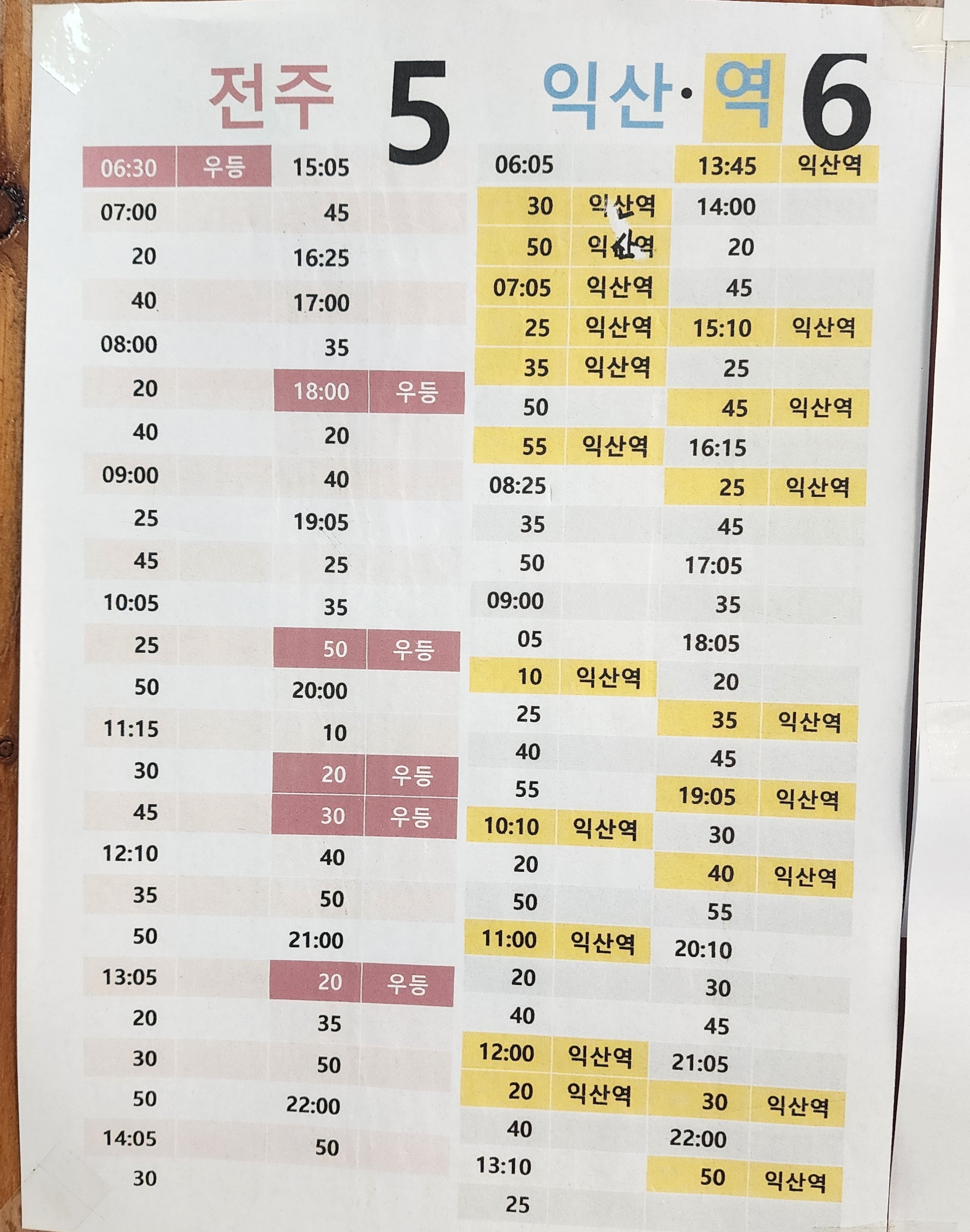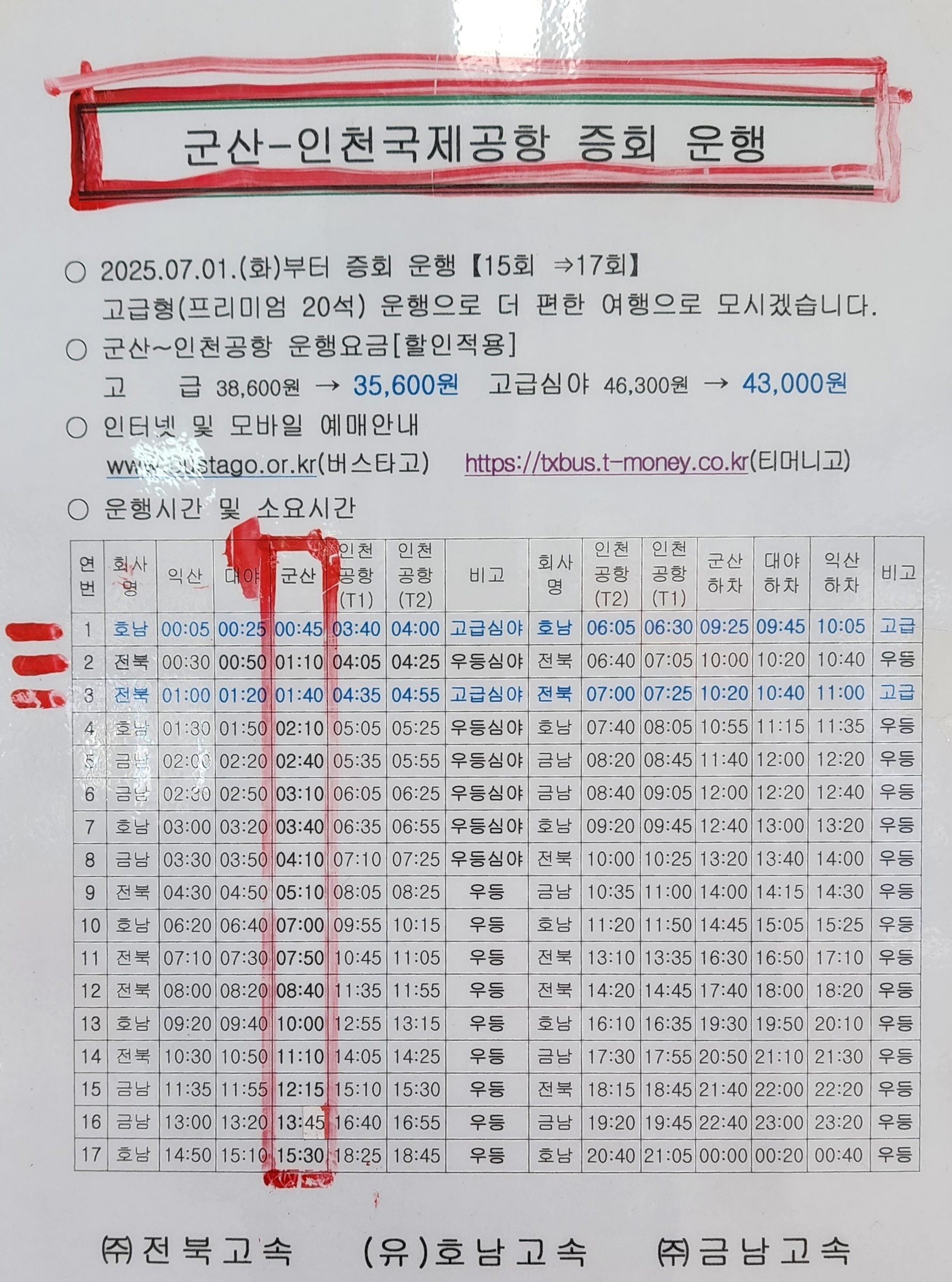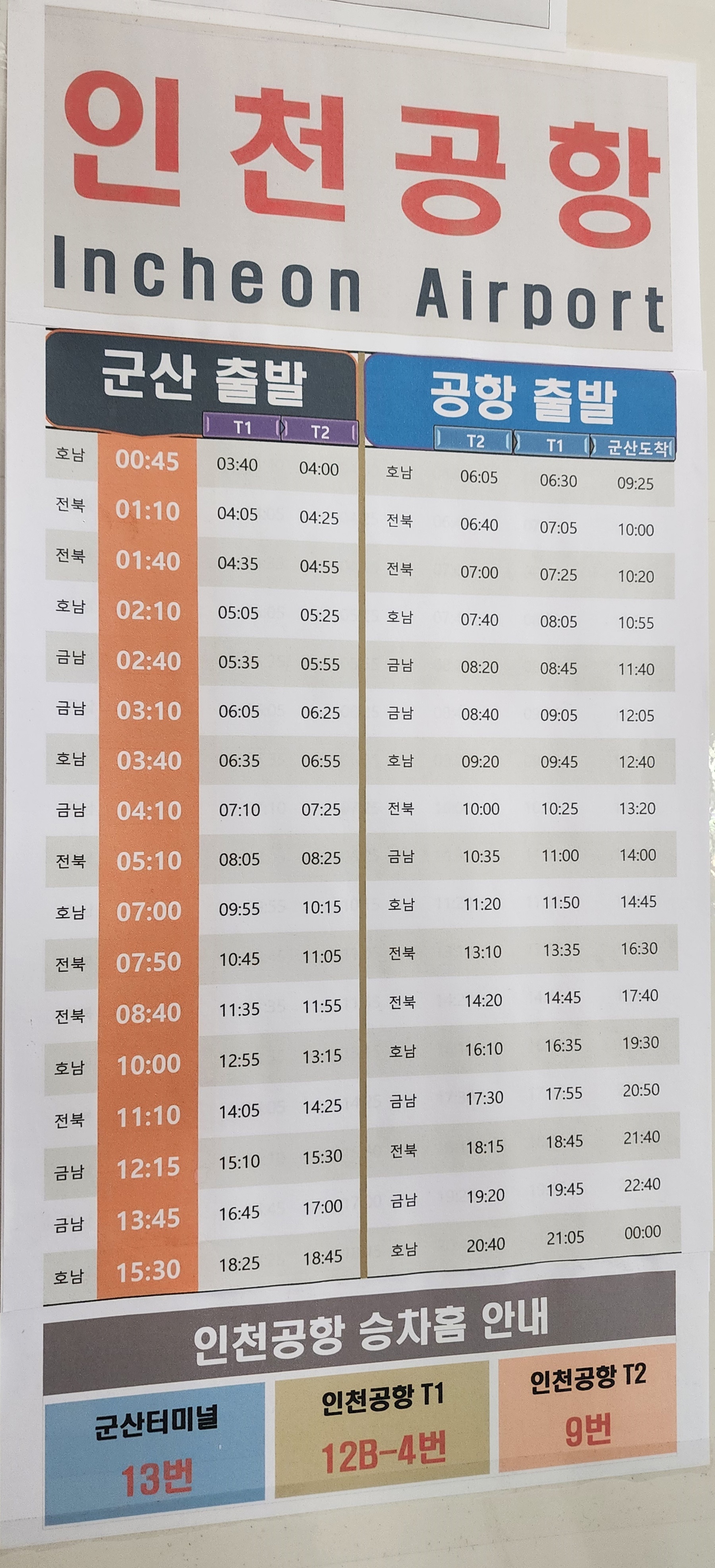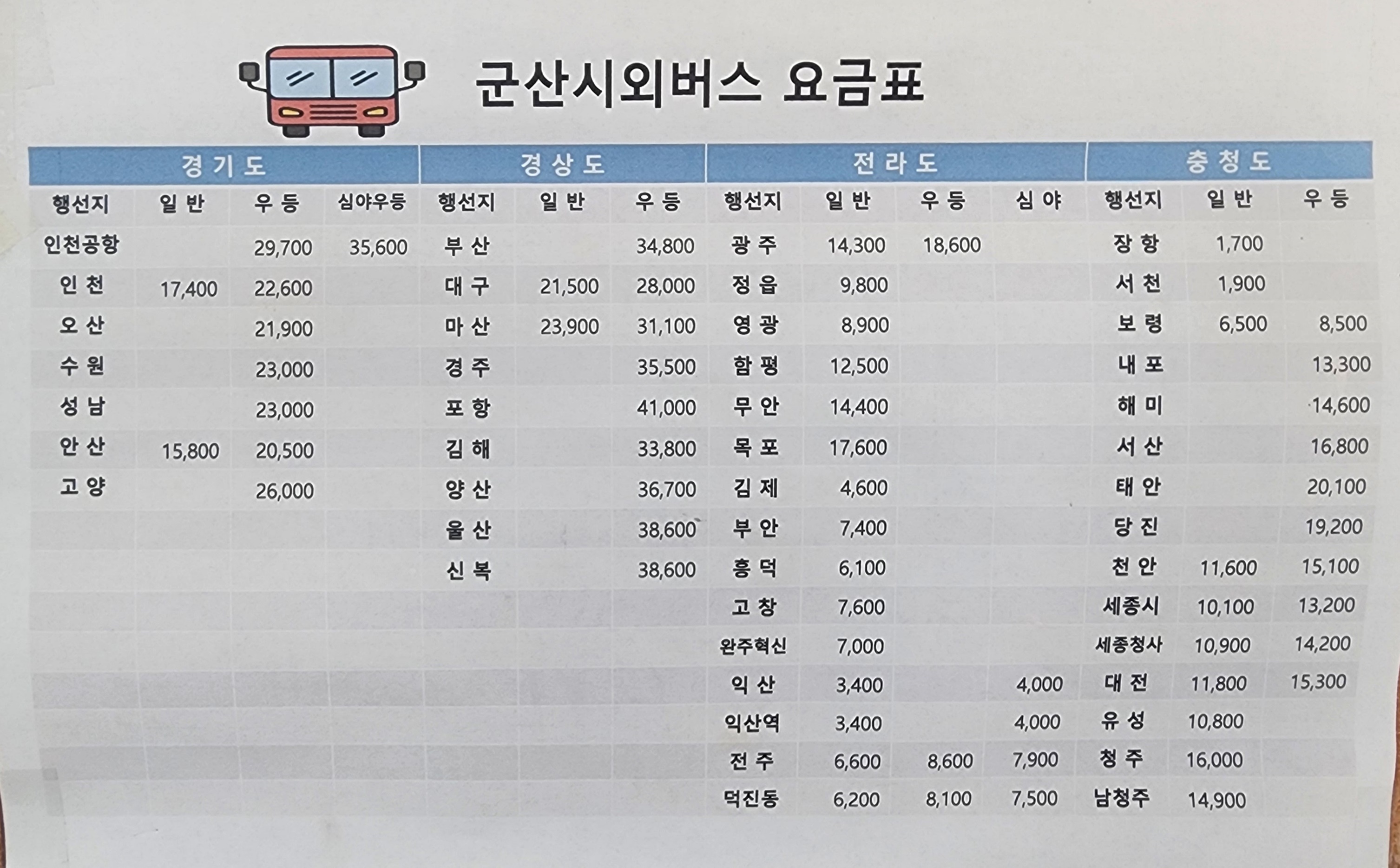 군산 출발 광주, 영광, 함평, 무안, 목포, 정읍, 김제, 부안, 흥덕, 고창, 완주혁신도시 전라도 방면.