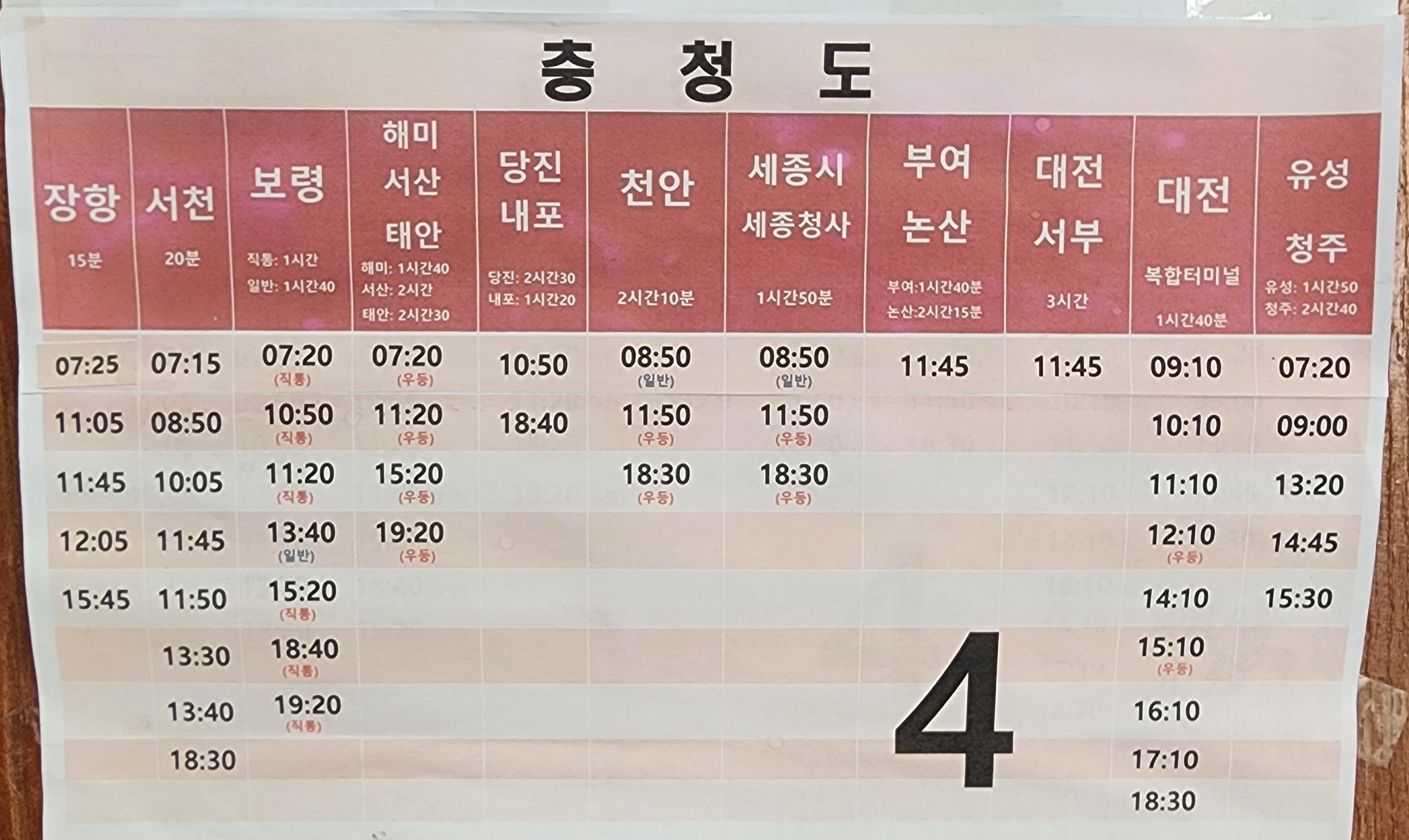 군산 출발 장항, 서천, 보령, 해미, 서산, 태안, 당진, 내포, 천안, 세종시, 세종청사, 부여, 논산, 대전, 서부, 대전복합, 유성 청주 충청도 방면.