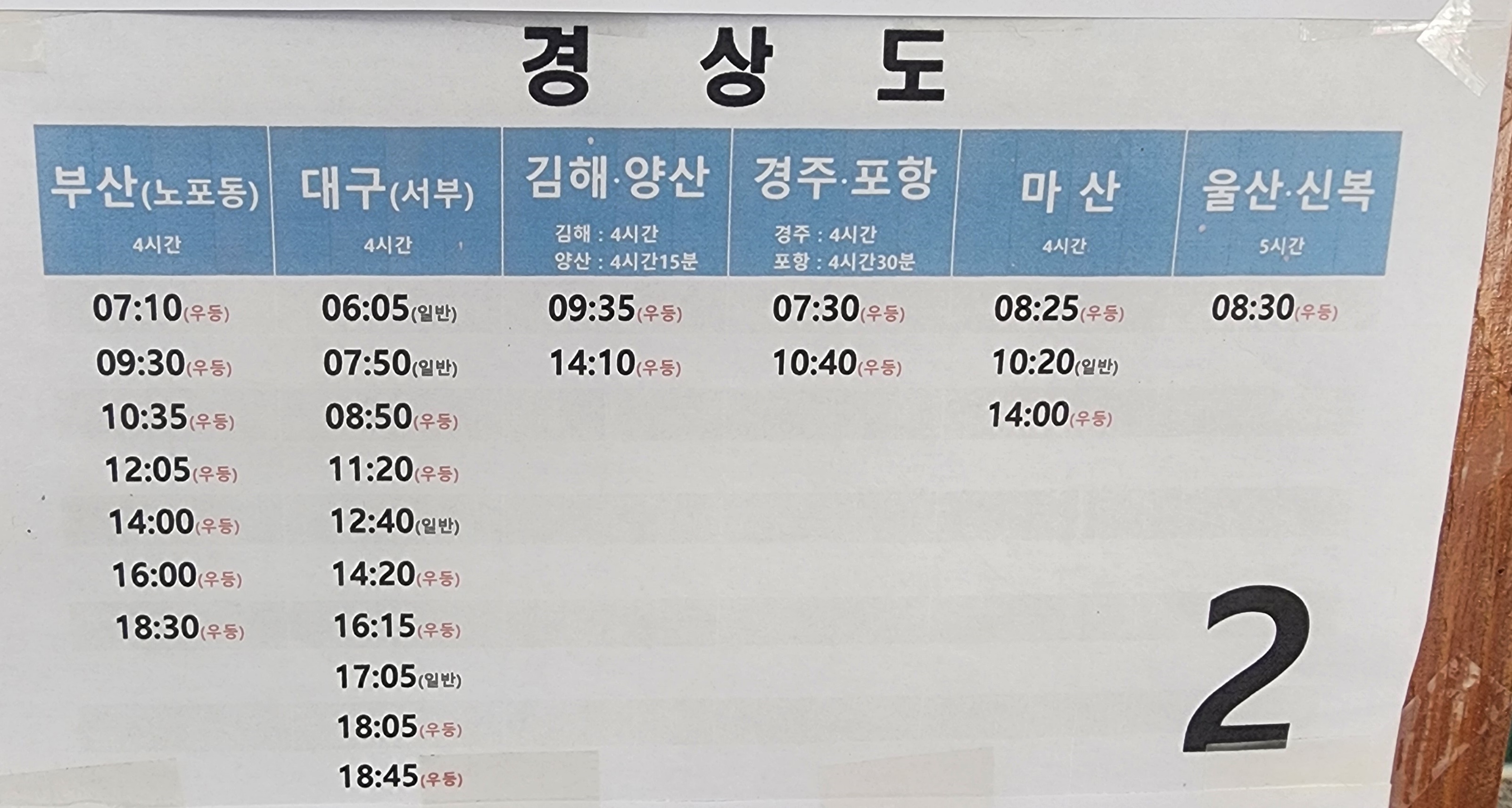 군산 출발 부산 노포동, 대구 서부, 김해, 양산, 경주, 포항, 마산, 울산 신복로터리 경상도 방면.