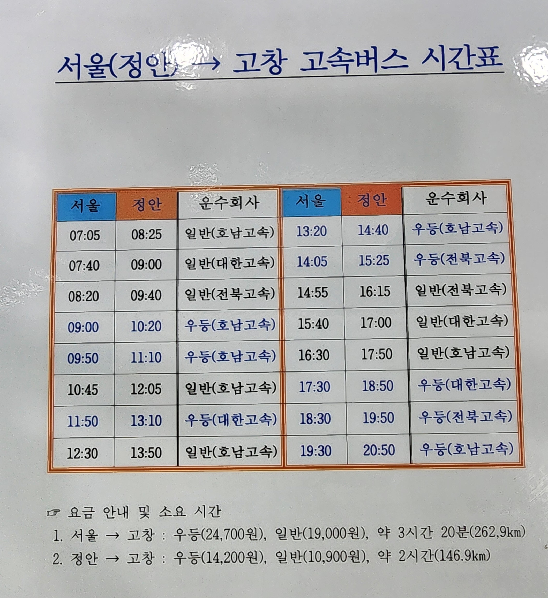 서울 출발 정안, 고창 시간표