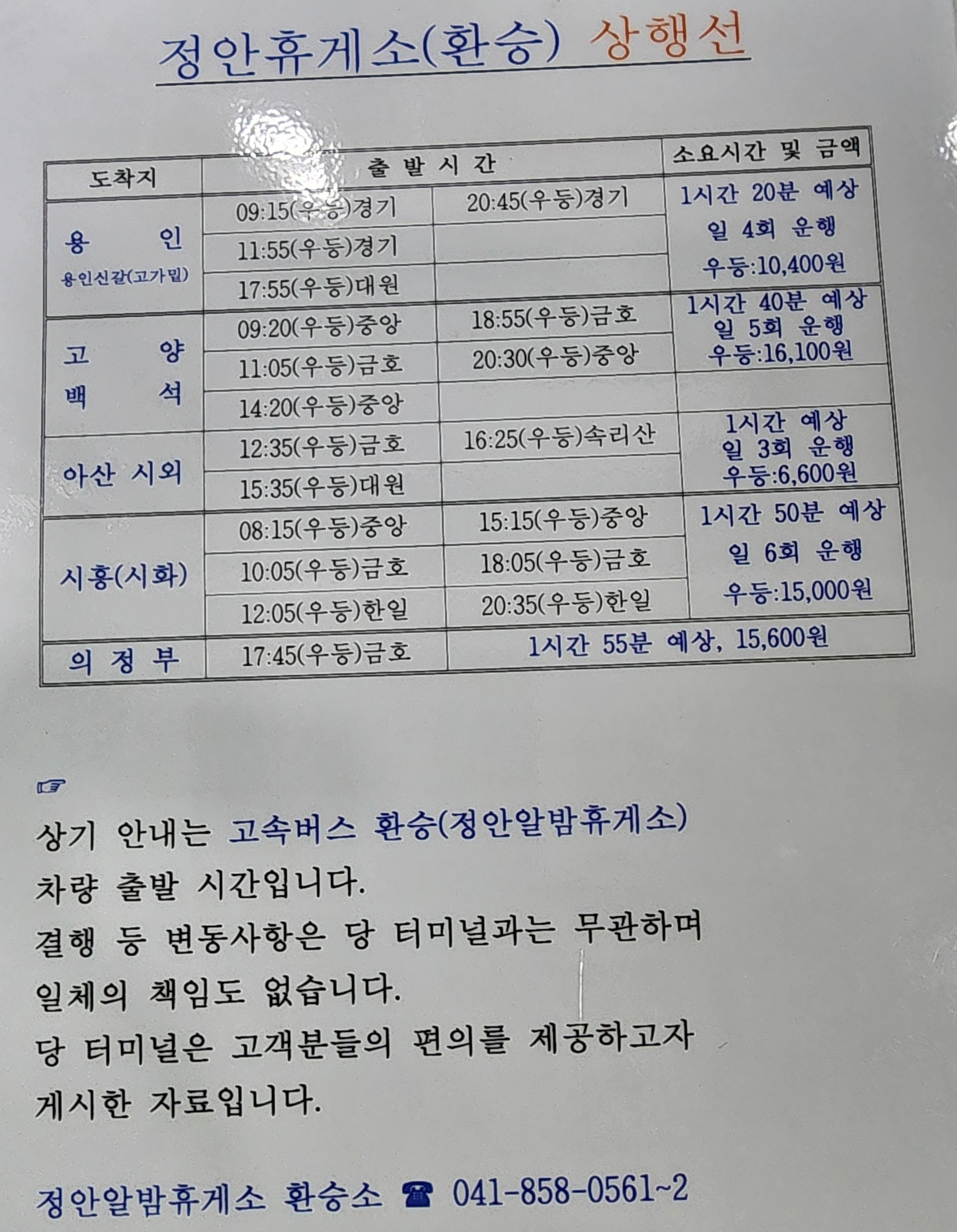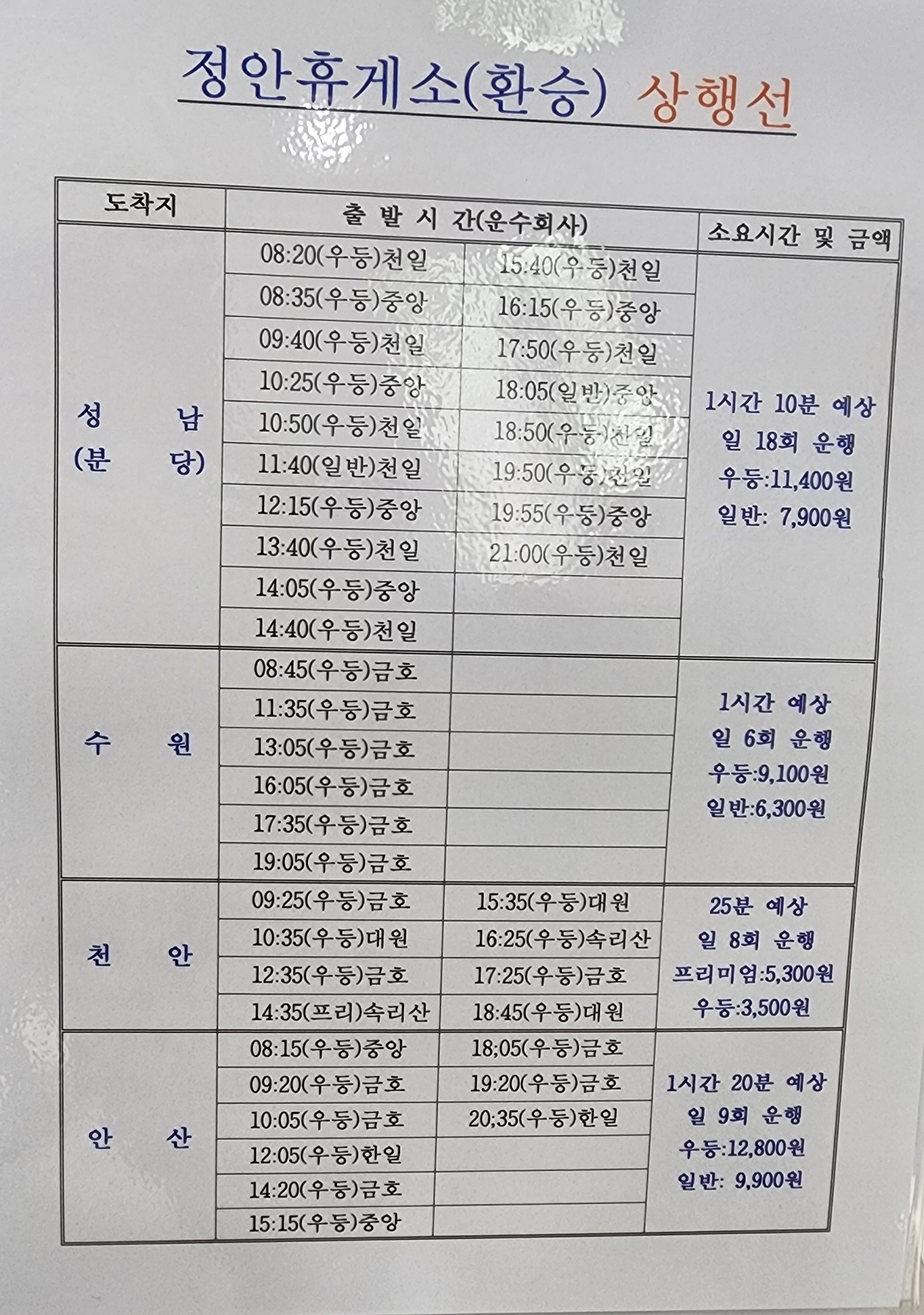 정안 출발 동서울, 인천, 정안휴게소 환승 상행선 시간표.