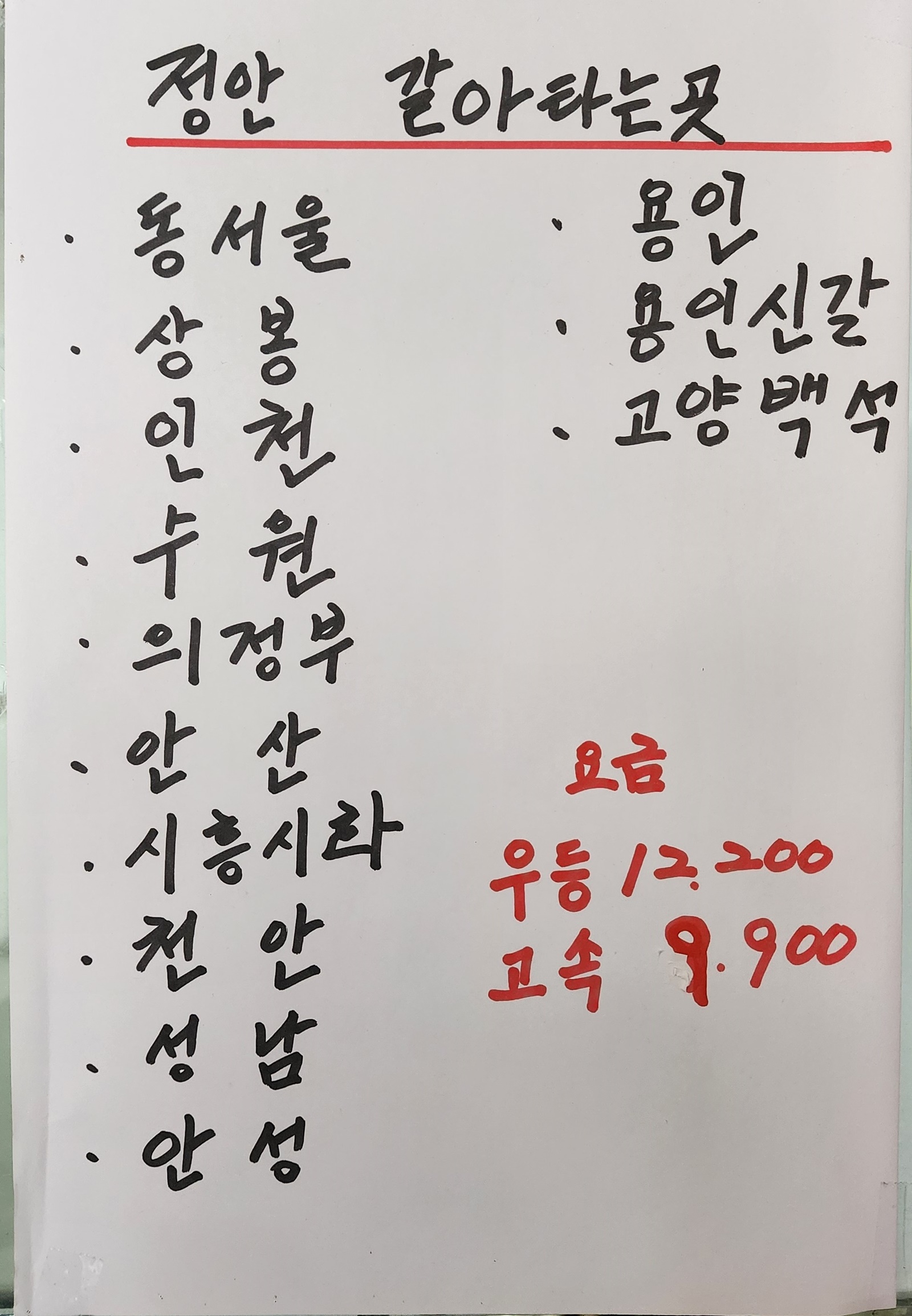 동서울, 상봉, 인천, 수원, 의정부, 안산, 시흥시화, 천안, 성남, 안성, 용인, 용인신갈, 고양백석 방면.