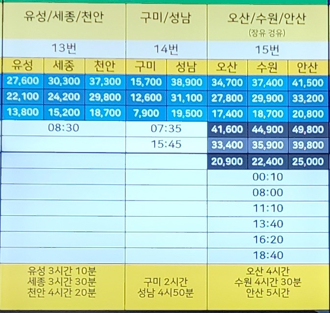 김해 출발 유성, 세종, 천안, 구미, 성남, 오산, 수원, 안산 방면.