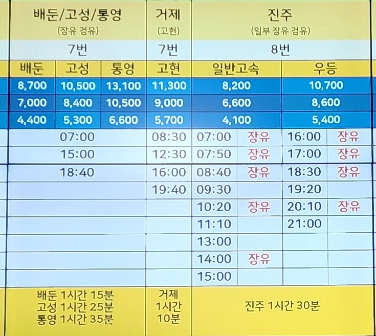김해 출발 배둔, 고성, 통영, 거제, 진주 방면.
