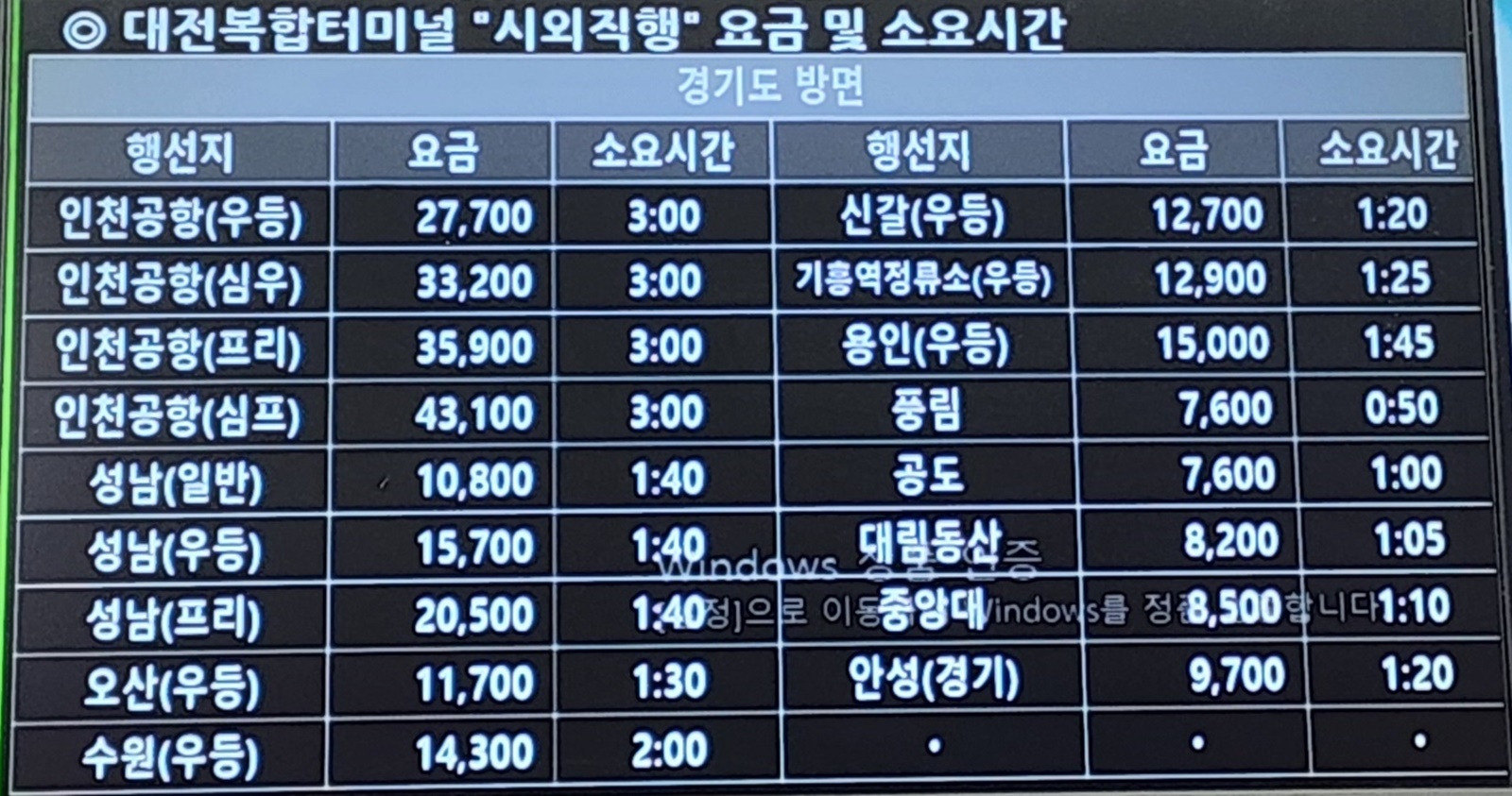 대전 출발 의정부, 안산, 안양, 안성 방면.