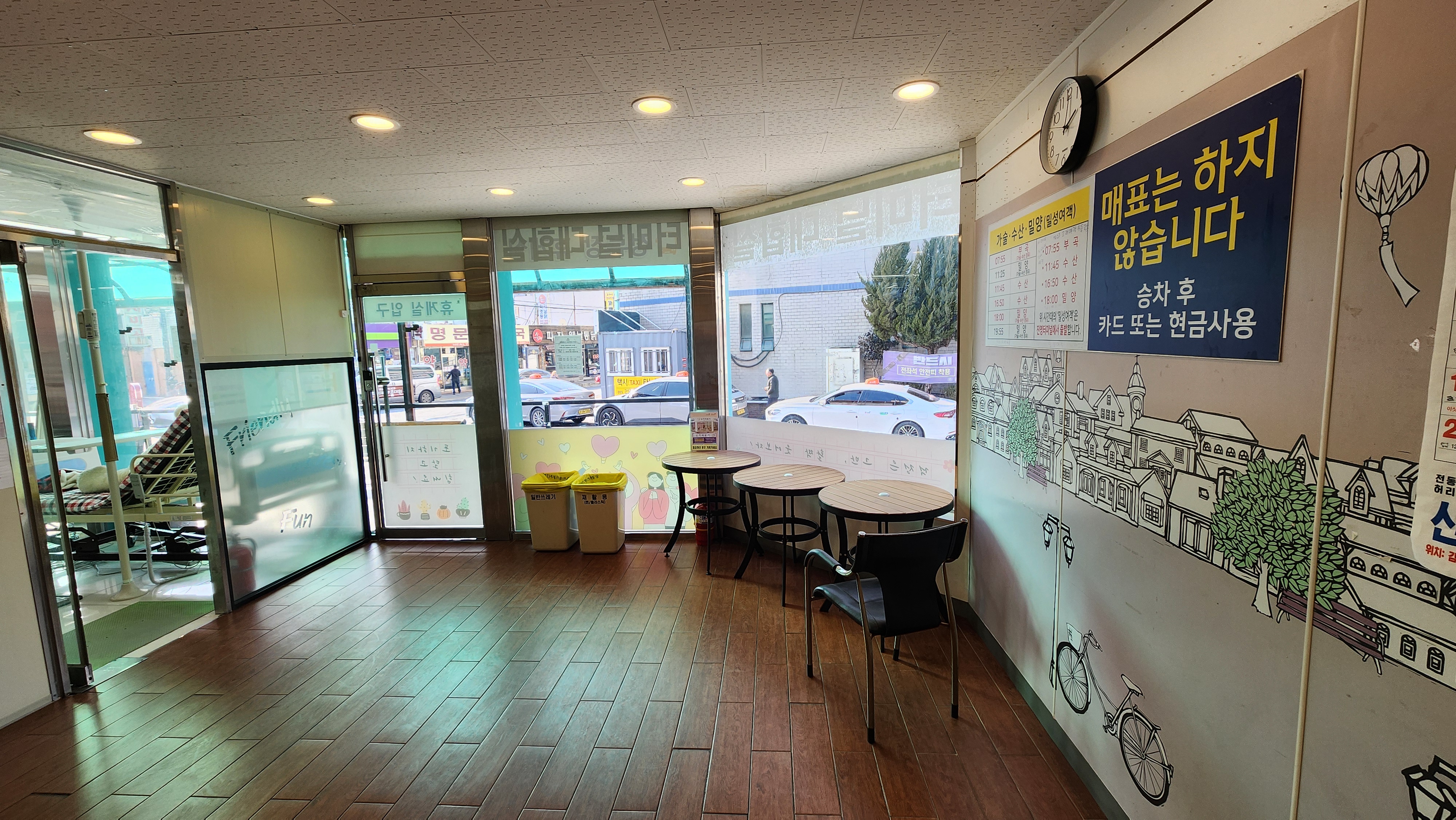 진영정류장은 최근 시설 정비가 이루어져 이전보다 훨씬 쾌적해졌습니다. 대기 공간이 마련되어 있고, 주변에 편의점과 간단한 간식을 살 수 있는 곳들이 있어 버스를 기다리는 시간이 지루하지 않아요.