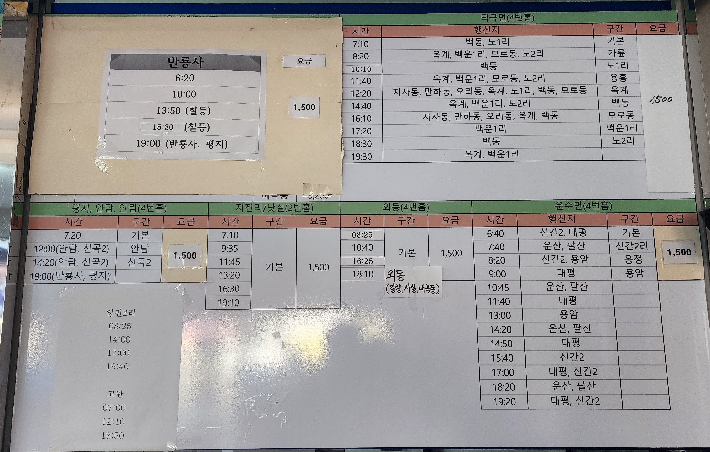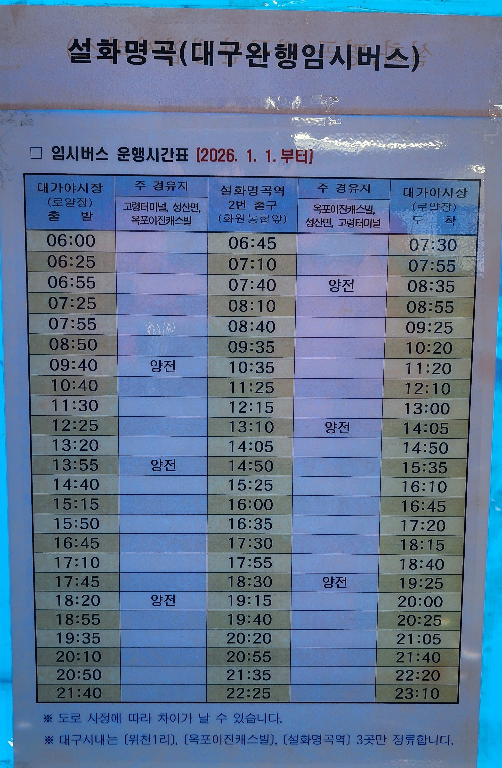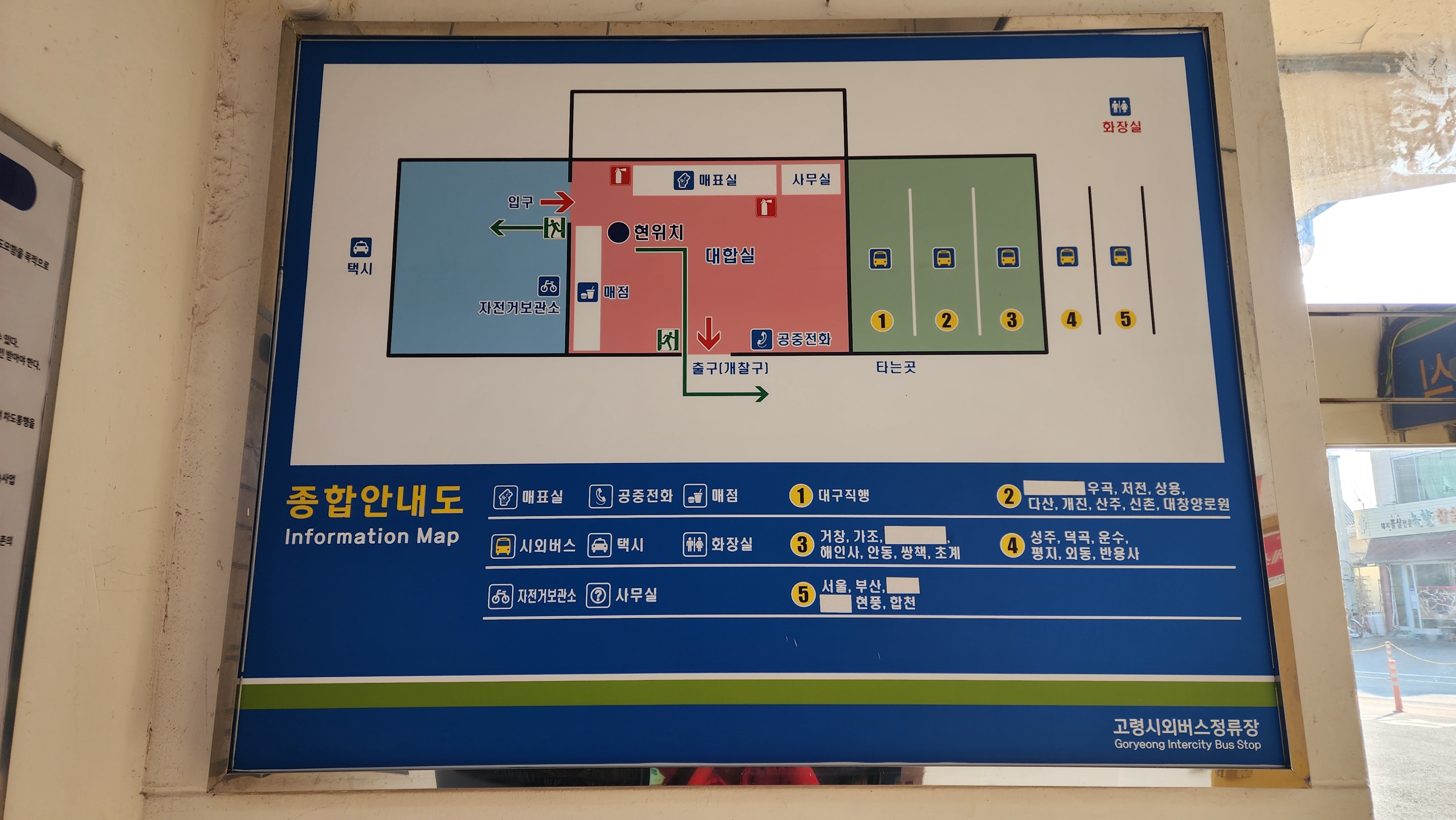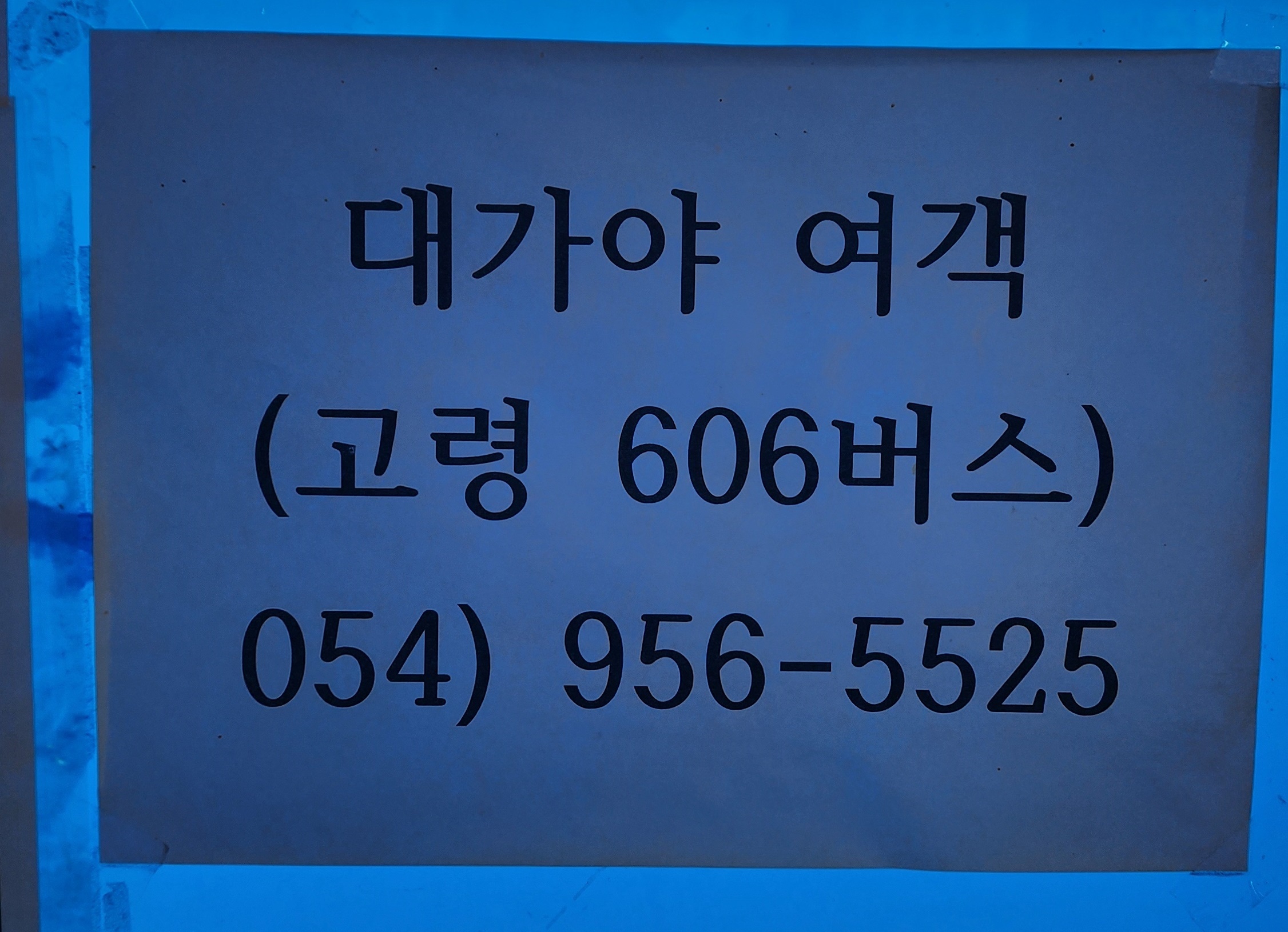 고령 관내(대가야읍, 성산면, 다산면 등)를 운행하는 농어촌 버스 시간표는 터미널 내 별도 게시판에 부착되어 있습니다. 대가야박물관이나 지산동 고분군 등 주요 관광지는 버스 이용이 가능하나, 배차 간격이 넓으므로 꼭 미리 확인하세요!