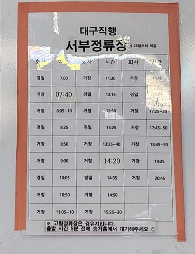 | 대구 서부정류장 | 약 40분 | 직행/완행 구분 확인 |