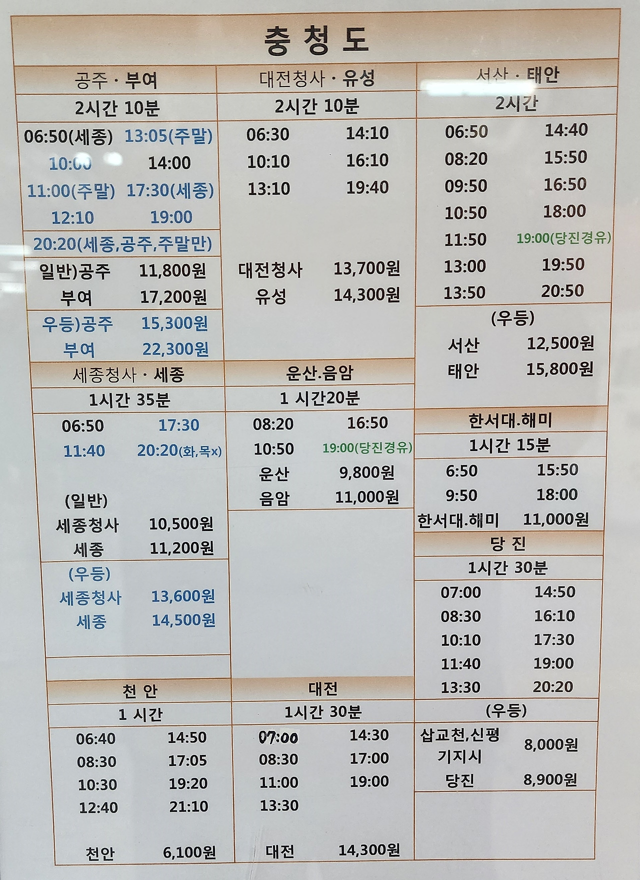 공주, 부여, 대전청사, 유성, 서산, 태안, 세종청사, 세종, 운산, 음암, 한서대, 해미, 당진, 천안, 대전.