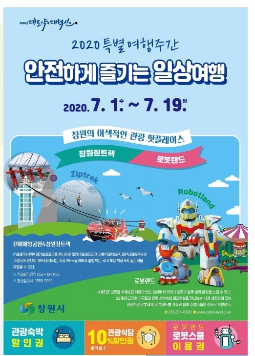 7월 1일부터 19일까지 ‘창원시 특별 여행 주간’ 안전하게 즐기는 일상 여행 창원관광안내소 스탬프 투어 2020 특별 여행 주간 창원의 여행이야기 듣고 창원짚트랙 이용권 응모하세요 여행주간 기간(7.1~19)에는 창원시민의 응모와 추첨이 가능합니다. 응모방법 1, 지정된 10개 관광안내소 중 "2개소"에서 창원의 여행 이야기를 듣는다. (스탬프 카드는 관광안내소에서 수령) 2, 스탬프를 2개 획득한 후 인적사항을 적고 해설사님께 제출한다. 3, 2020년 8월 5일 당첨자 10명에게 보내는 문자를 기다린다. (창원관광홈페이지 게재) 창원관광안내소 현황(10개소) 1, 저도 연육교 2, 해양드라마 세트장 3, 경남선교 120주년 기념관 4, 돝섬 5, 마산역. 6, 창원의 집 7, 시티세븐 8, 봉산 패..